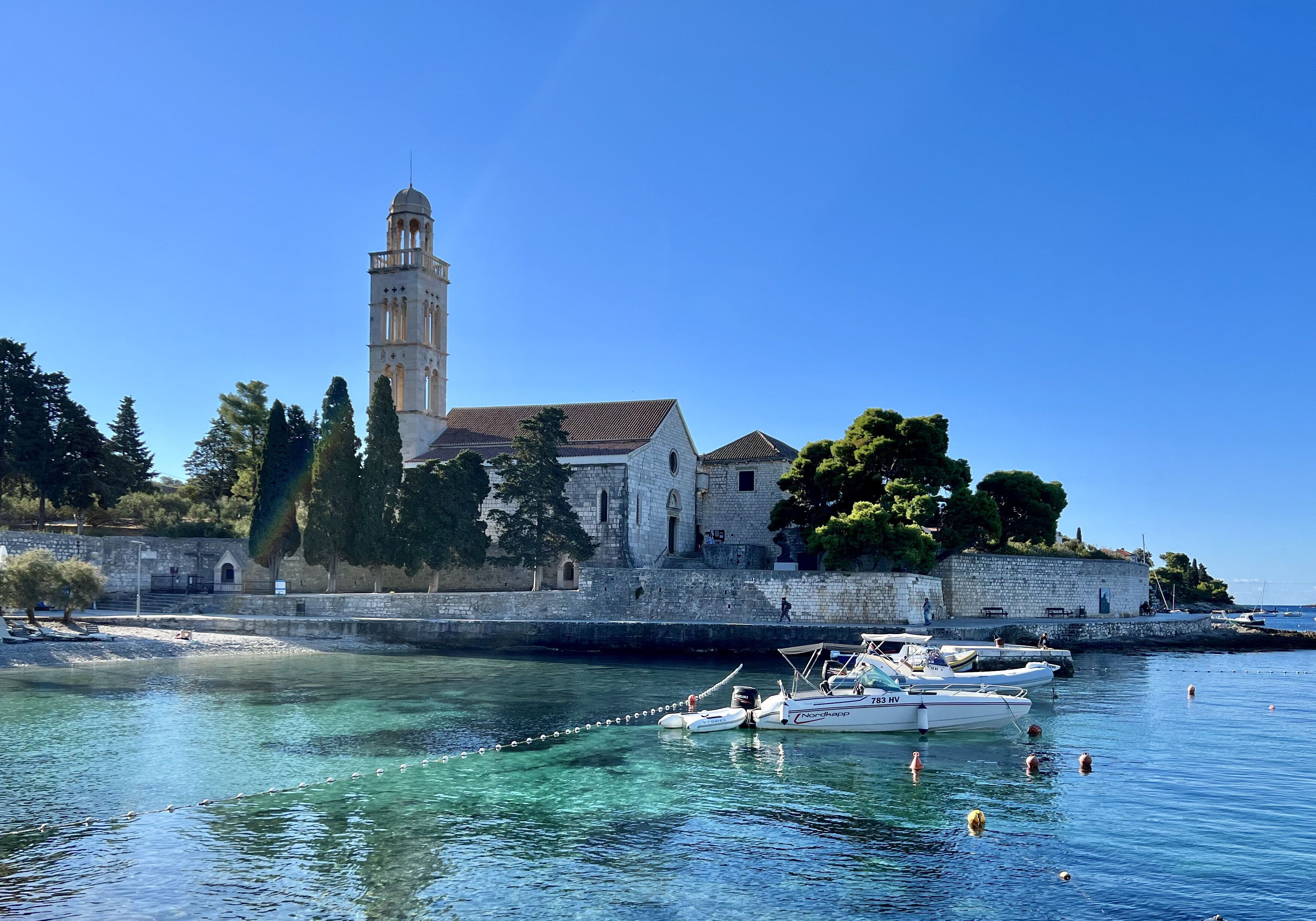 It’s hard to believe it is the last day of our magical cruise along the Dalmatian Coast. A visit to the beautiful island of Hvar, the “lavender capital” of Croatia, was the perfect way to end our voyage. Sea Cloud slipped through the narrow channel between the Pakleni Islands and dropped anchor just in front of the old Venetian harbor of the town of Hvar. We tendered into the pier for an early morning walking tour of this delightful town full of Venetian-inspired Renaissance palaces with pointed trefoil windows and ground-floor loggias. Cafes, bars, and lavender stands lined one side of the quay, while yachts and catamaran ferries from the Split jostled for position on the other. Our guides took us along the seawall and out to the Franciscan Monastery to see their little physic garden with its 500-year-old cypress tree and the impressive 16th century painting of the “Last Supper” that dominates the monk’s refectory. This magnificent work was done by a Venetian artist of the school of Paolo Veronese. The artist was shipwrecked on the island and nursed back to health in the monastery. We wound our way back to the main square, then climbed up through the narrow Porta Maestra that was once the main entrance to the fortified section of the town. We stopped in front of the small Benedictine convent, where five cloistered nuns still make lace from the fibers of the agave plant. After a visit to the basilica of St. Stephens on the main square, some of us fanned out on our own to explore the alleyways leading up to the Venetian fortress that protects the city, while others chose to buy a few lavender products or just sit and enjoy a cool drink in one of the many bars along the quay. All too soon, the tenders arrived to shuttle us back to the ship so we could partake in the famous “parmesan wheel” pasta feast on the Lido Deck. As we moved away from Hvar, the captain had the sailors go aloft for one last afternoon under sail.