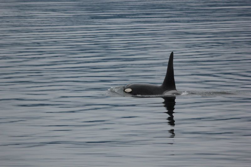 Whale researchers have been looking for the resident fish-eating killer whales this season, indication of poor king salmon runs perhaps. We enjoyed a sensational encounter with resident orcas this morning in breathless sea conditions, whose appearance interrupted a marine mammal talk at the perfect moment when they were to be discussed. Perhaps two dozen killer whales were stretched out in small groups across the strait, traveling slowly in the same direction. At least four adult males with tall dorsal fins impressively cut the silken surface of the ocean scene, as young calves leapt exuberantly beside their surfacing moms.