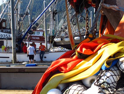 Salmon fishing season is in full swing and the bustle in the harbor reflected an expectant readiness for the next opening. The fishing industry in Alaska is highly regulated and subsequently successfully sustainable, a goal that few have been able to attain. We strolled the dock and learned from Pete about the different rigs for fishing the five species of Pacific Salmon, as well as for halibut and cod or sable fish.