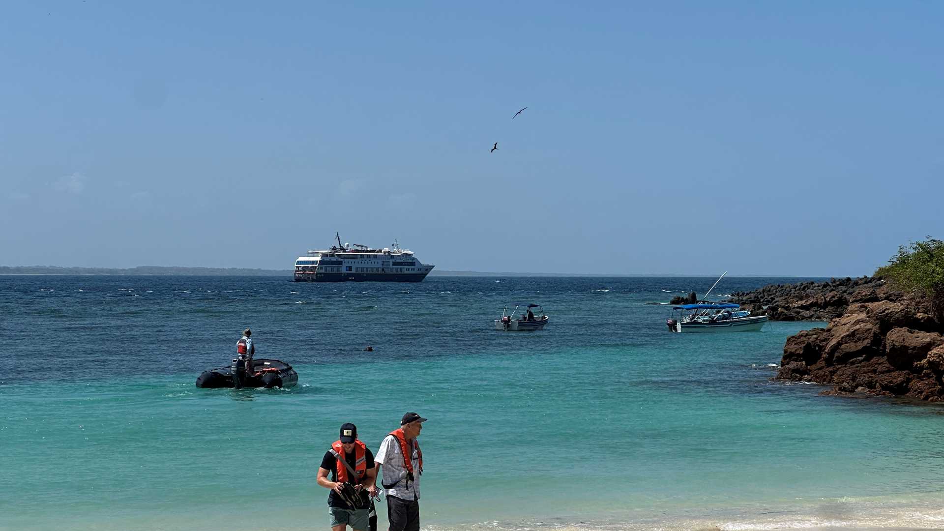 Eager to explore, we disembarked with our trusty Zodiacs and stepped onto the shore to walk along narrow trails, spotting iguanas basking in the sun and many magnificent frigatebirds hovering above our heads in the sky.