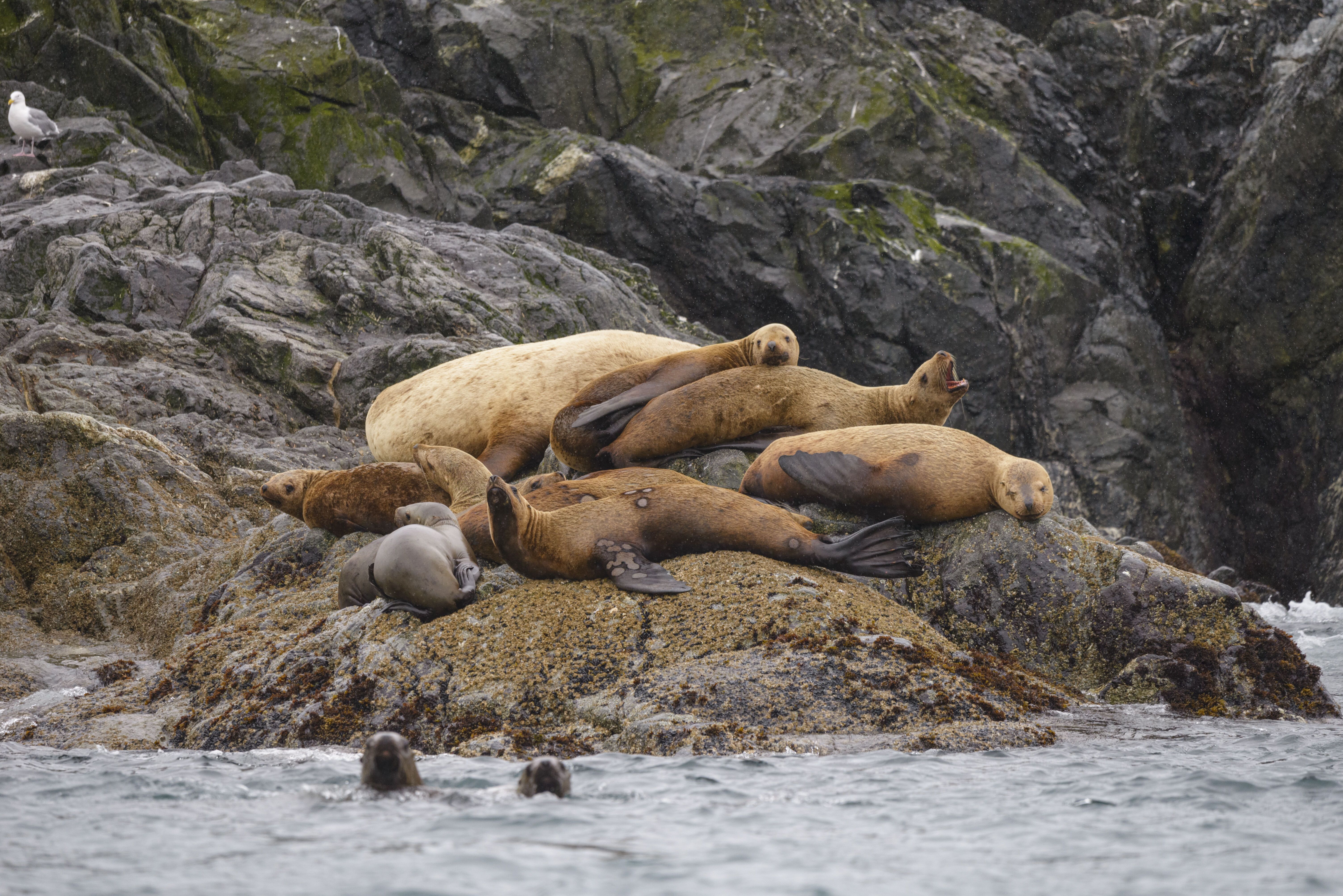 Navigating the channels in our Zodiacs, we watched as pigeon guillemots, pelagic cormorants, gulls, and bald eagles soared overhead. The ever-productive waters of these islands produce plenty of baitfish for all these species – and more – to enjoy. The lively scene continued as we came across a colony of Steller sea lions lounging on rocks and playfully swimming around us. Their antics and distinct calls added to the fascination of our expedition.