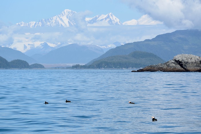 Today, guests awoke to a gorgeous Southeast Alaskan morning with real, honest-to-goodness blue skies above. Anchored in the Hobbit Hole, National Geographic Quest had humpback whales and harbor porpoises surfacing all around while guests climbed into Zodiacs to cruise around the Inian Islands for the morning. The Inian Islands are located just north of Chichagof Island, tucked into the corner of the Gulf of Alaska and Cross Sound. This very special cluster of islands experiences the tidal currents in a unique way: the proximity of the islands to each other funnels the ocean very tightly, creating standing waves and upwelling events in seemingly random areas all along the coastline. Guests wore waterproof clothing even as the sky showed no signs of rain; wildlife enjoys these wild currents because of the nutrients stirred up to the surface and are often found feeding in the ripping tidal lines. Steller sea lions pop up all around the Zodiacs as the aroma of hundreds of gulls, black-legged kittiwakes, and pelagic cormorants overcomes the Zodiac cruisers. Adorable sea otters—one of the only members of the weasel family to live in a fully marine environment—raft together in the tops of a kelp forest to keep from floating away on the strong ocean currents. The Fairweather Mountain Range peeked out behind the southern boundaries of Glacier Bay National Park and Preserve as both tufted and horned puffins flew overhead. An altogether spectacular morning.