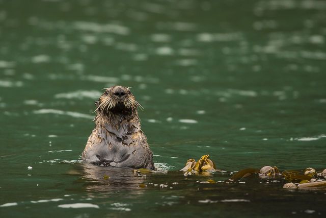 Some of us were lucky to witness a rarely seen occurrence of a sea otter climbing out of the water up onto an algal-covered rock to rest (Figure C). Perhaps he just wanted to get out of the strong current. In a protected cove on the main Inian Island, we examined a patch of bull kelp and found one sea otter preening and rolling in a way that would have induced envy among the best contortionists, while a couple others were nestled within the kelp and resting (Figure D).