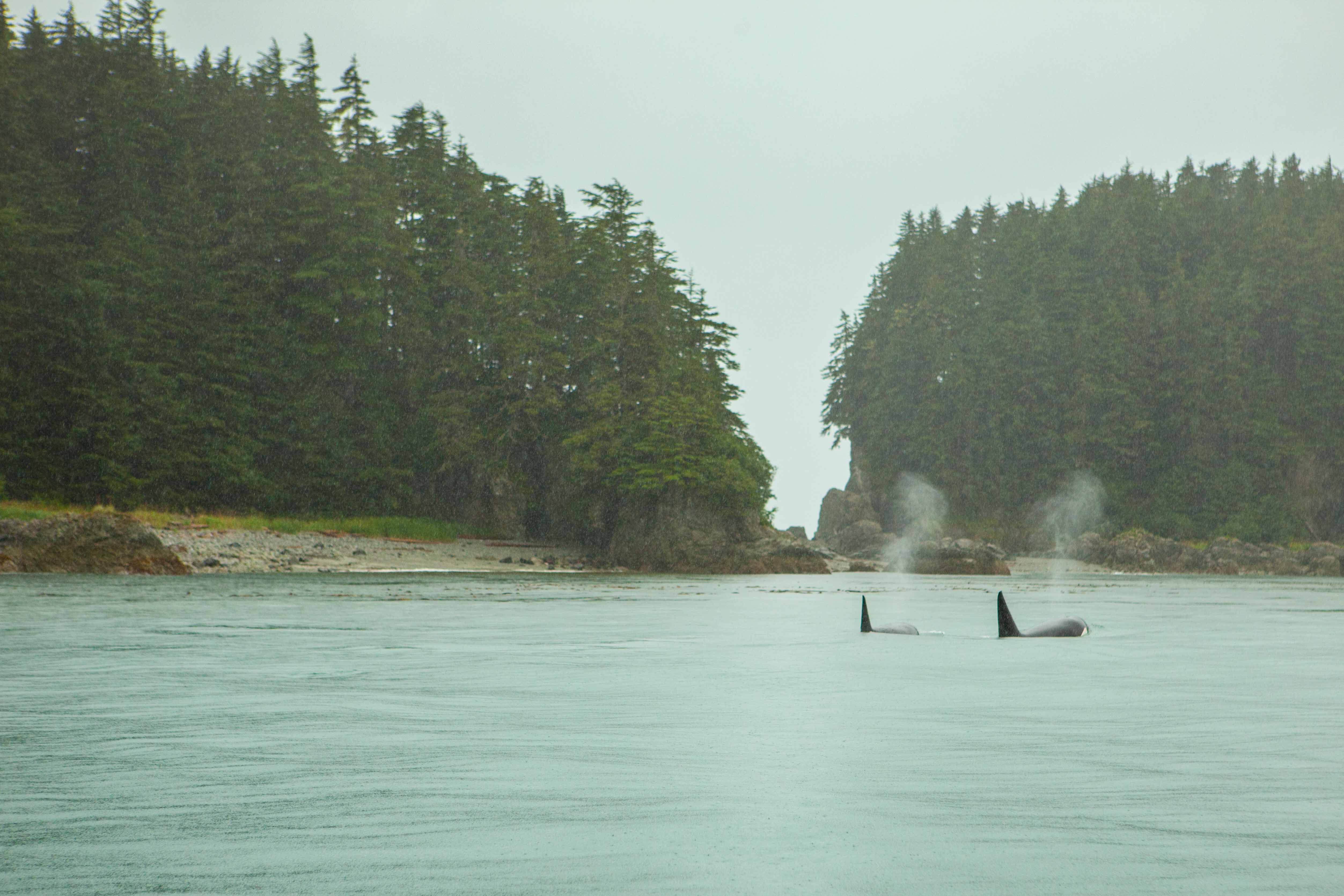 Guests piled into small watercrafts to take to the ocean for a morning Zodiac cruise. Beginning with geologic explanations, naturalists and drivers cruised towards the first wildlife hub near the outer coast. A rookery of Steller sea lions sits near an area of heavy current, waiting for salmon and halibut to get close. The Steller sea lions are the largest species of eared seal worldwide. At 2,400 pounds, the males can reach 12 feet long. The females are significantly smaller, and this species enjoys spending time together on land. Moving on from the Steller sea lions, the vessels rounded the corner to encounter incredible animals that are rarely seen from small boats. Transient killer whales, or biggs killer whales, moved in a small pod towards the sea lion rookery. Three adults, one male, and two females slowly and methodically navigated towards their potential prey. These whales reach a maximum size of roughly 30 feet, with a male dorsal fin rocketing to six feet tall.