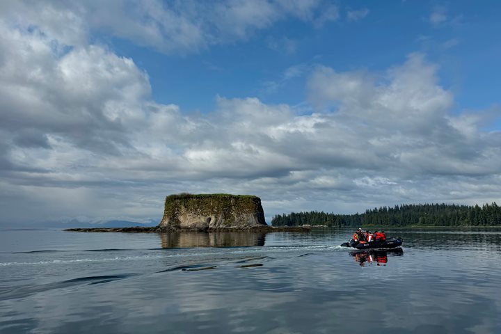 We woke up to flat, calm seas with sea otters, marbled murrelets, and harbor porpoises all over the place, and the Fairweather Range looming overhead in the distance. We knew that when we dropped anchor we were in for a treat as our morning Zodiac trips around the Inian Islands were timed for a strong flood tide. In addition to a thrilling ride in the raging currents, the flood tide meant that sea lions and bald eagles would be gorging themselves on fish brought up from the depths in the upwelling. We even saw a sea otter chowing down on a basket star and a humpback whale, all before lunch!