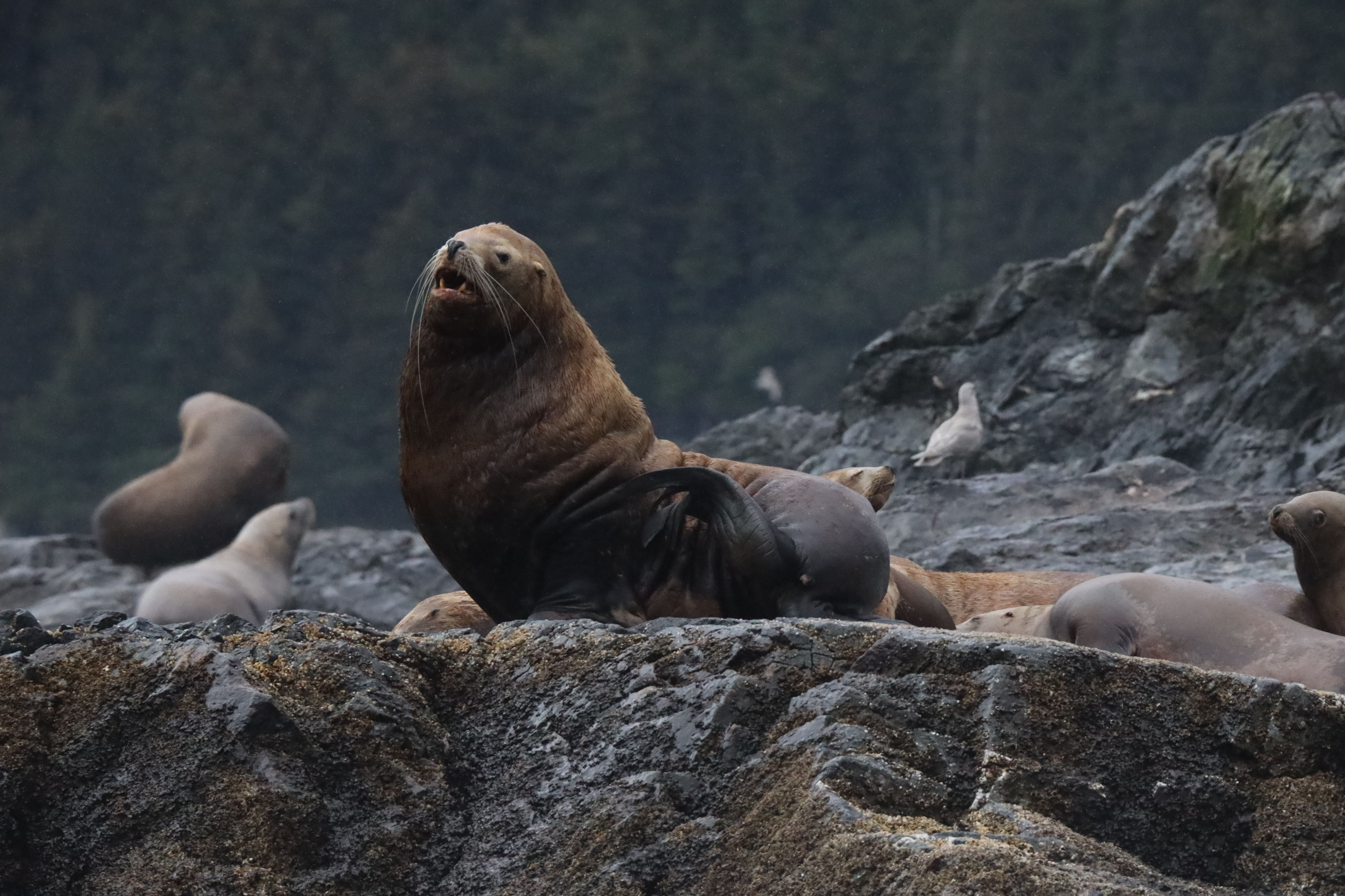 After a few lucky days of sunshine, we awoke to a scene of drama with gentle rocking from the swell as we turned the bow of National Geographic Quest into our anchorage at the Inian Islands. This morning was one that will remain in our memories for a long time to come. Loading into the Zodiacs, we crested on the slow rolling waves, feeling the true power of the ocean. Bird Rock came into view, and we marveled at the acrobatics and sheer size of the Steller sea lions. These giants, with the largest males reaching 2,000 pounds, looked upon us with curiosity. They swam near the Zodiacs and gazed at us with the same intensity we were giving them. The morning didn’t end there. We were graced by sea otters lounging in the kelp and a variety of seabirds, including rhinoceros auklets and double-crested cormorants.