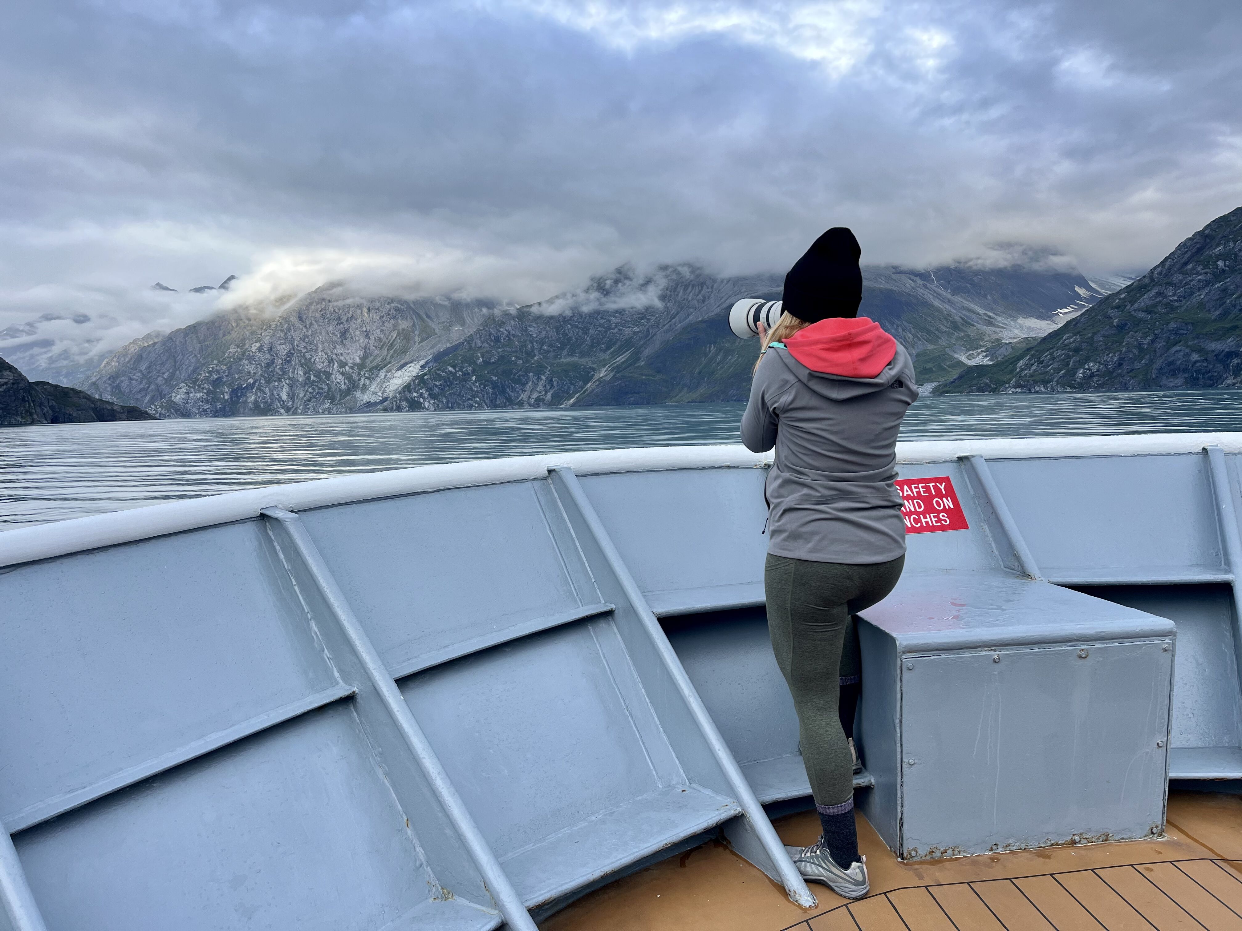 After a full morning experiencing the wild wonders that Alaska has to offer, we transited a short distance to George Island. It was time to explore another promising location! We experienced it all by land and water. Some of us started out kayaking, getting an up-close view of the kelp and jellies that live just below the water, while others investigated the fungi and moss along the trails of the island. We all convened at the beach, and those bold enough stripped down and took the polar plunge. Cheers erupted as our brave plungers truly experienced the ocean that has been guiding us along this trip.