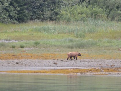 It's hard to believe we packed so much into one day! We woke up in Idaho Inlet, a narrow slice of water cutting into northern Chichagof Island. Waters were flat calm; everything was in shades of gray. Floating placidly, unperturbed by our presence, were rafts of wily water weasels—sea otters, the superstars of survival! Returning to north Pacific waters with a vengeance matched by the appetite of King Kong, sea otters are reshaping the underwater world beneath our hull by doing what they do best: eating. A couple otters bobbed past, crabs, clams, and other delicacies balanced on their tummies as they chomped them to bits with gusto. Inspired, we followed their example and headed to breakfast.