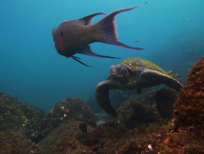 Life and actions are unexpected in the Galapagos, and as a naturalist, although by experience I have a general idea of which species we might see, at the same time, I actually never know what surprises these islands will have ready for me every day we go out there and explore. The Galapagos penguins were just bathing on the surface of the ocean and some others were fishing and swimming around our guests. We snorkeled around the same cove, and this time the penguins got a bit closer to us underwater while these small fellows were fishing and having a buffet right in front of our eyes. We encountered many Pacific green sea turtles and swam with them for around an hour.