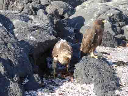 In the afternoon and after navigating south, we reached Punta Espinoza, Fernandina Island which is located at the western most point and considered the youngest island in the archipelago. We disembarked on the small dock and immediately treaded our way carefully among dozens of marine iguanas and lava lizards. We crossed by the only white beach of this side of the island where a great number of marine iguanas worked tirelessly making their nests. We crossed to the end where the rocky terrain began to receive us with a special surprise, three Galapagos hawks! There were two adults (the parents) teaching their offspring how to kill and eat marine iguanas.