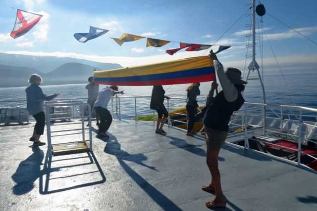 Quite a day full of fantastic experiences! After a night-long navigation we reached the western isle, the most remote region of the Galápagos archipelago. In the early morning sunshine we woke up to stunning landscapes of elegant volcanoes and lava fields. The north of Isabela is crossed by the equator line, so a ceremony to celebrate this event was a must! When we dropped anchor at Punta Vicente Roca, we suddenly felt we had somehow reached some Nordic fjords, with the tall, dark outer slopes of Ecuador Volcano nearby. Fernandina to the west is the youngest of the Galápagos Islands and is rather dull and inhospitable-looking, but as soon as we set foot on it we realized we had reached a new dimension. It is a world entirely dominated by reptiles, where the endemic marine iguanas are king. On the nearby shores, endless numbers of marine turtles, and young Galápagos sea lions made this a day we shall never forget.