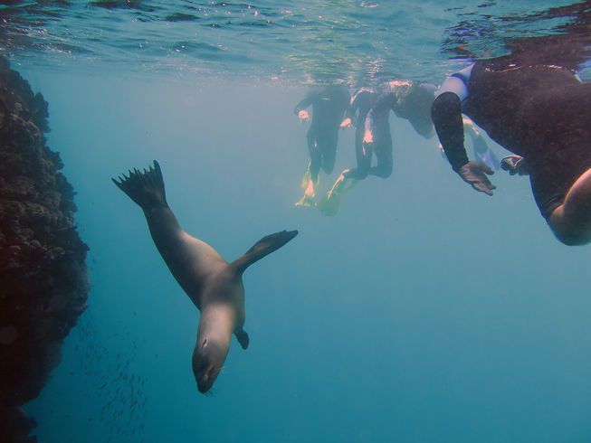 The ocean was as calm as I’ve ever seen it. We sailed a good distance along the northern shoreline of Isabela before breaking into a fogbank–cooler waters! But they were no deterrent to intrepid snorkelers. The western region of Galápagos is subject to strong upwelling ocean currents coming in from the west—an undercurrent as well as countercurrent. The richness it creates was evident as soon as we approached shore. Flightless cormorants, large marine iguanas, Galápagos fur seals, sea lions, ocean sunfish, Galápagos penguins! A menagerie of wildlife.