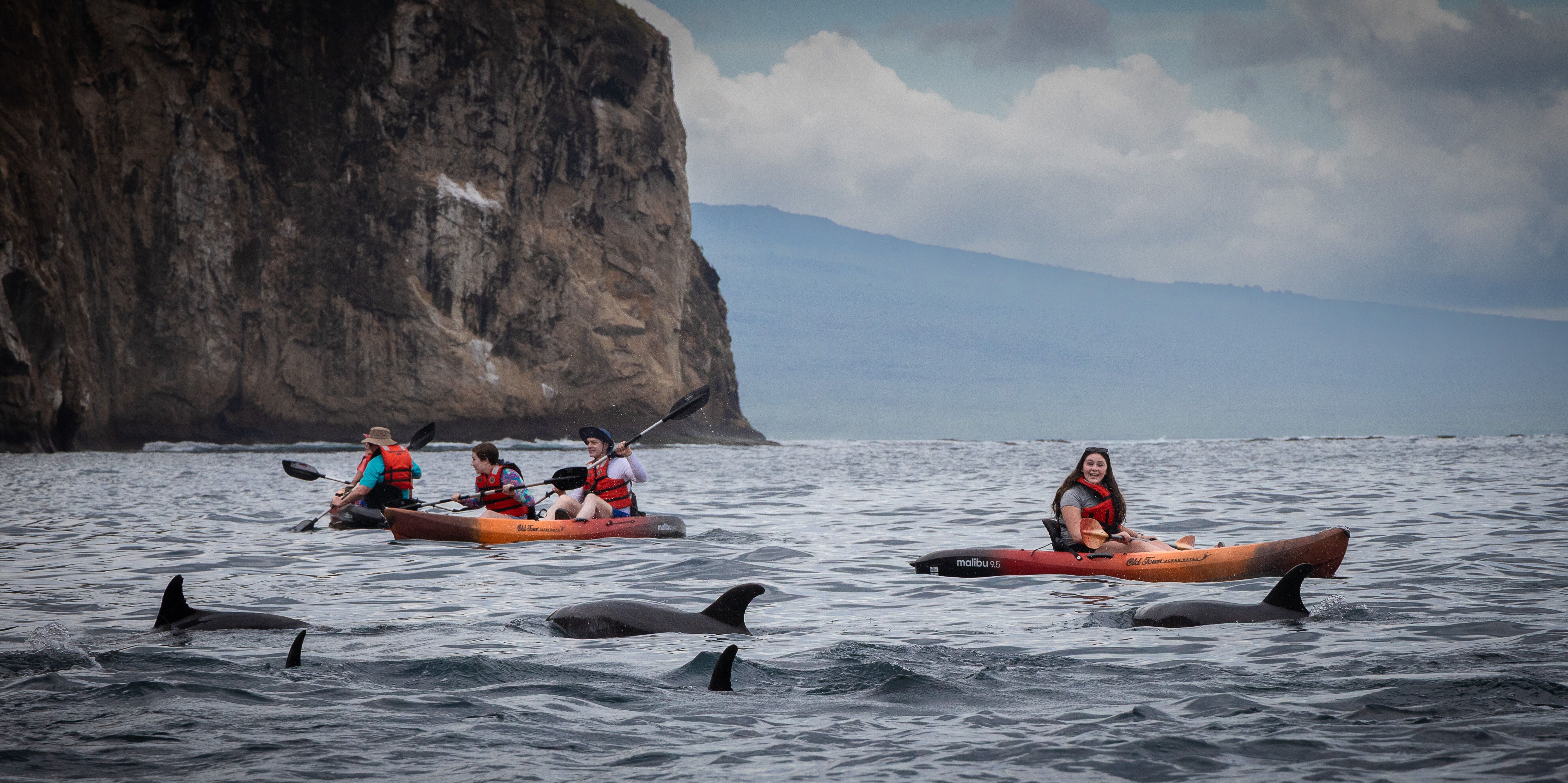 As soon as I stepped outside the cabin, I could feel the difference. The wind blew warm, but not oppressive. We were north of Isabela Island where the upwelling current cools the air. Just after 6:00 a.m., the first whale blows could be seen, and sperm whales entered our lives. A few very light blows suggested calves, but mostly adult females made themselves known. Two breaches were made!