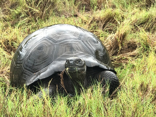 The coast line and sea floor at Urbina was uplifted in the mid 1950’s and it is interesting to walk past exposed coral heads and marine encrustations that are now deteriorating in the air, but were once under the sea. We offered two hike options this morning and both began from a steep black sand beach.  We dried our   feet and put on our hiking shoes while a drizzle that soon turned to rain fell and low clouds shrouded the volcanoes of Isabela. Socrates took a dozen hikers on a two mile loop trail that started along the coast and turned inland. Lenin and Walter took those who opted for a mile walk. We were all soon wet to the bone! But the giant tortoises love this kind of weather and we found nearly twenty tortoises of all sizes and a few colorful yellow land iguanas. It was well worth getting wet to see these ancient lumbering reptiles in their natural habitat!