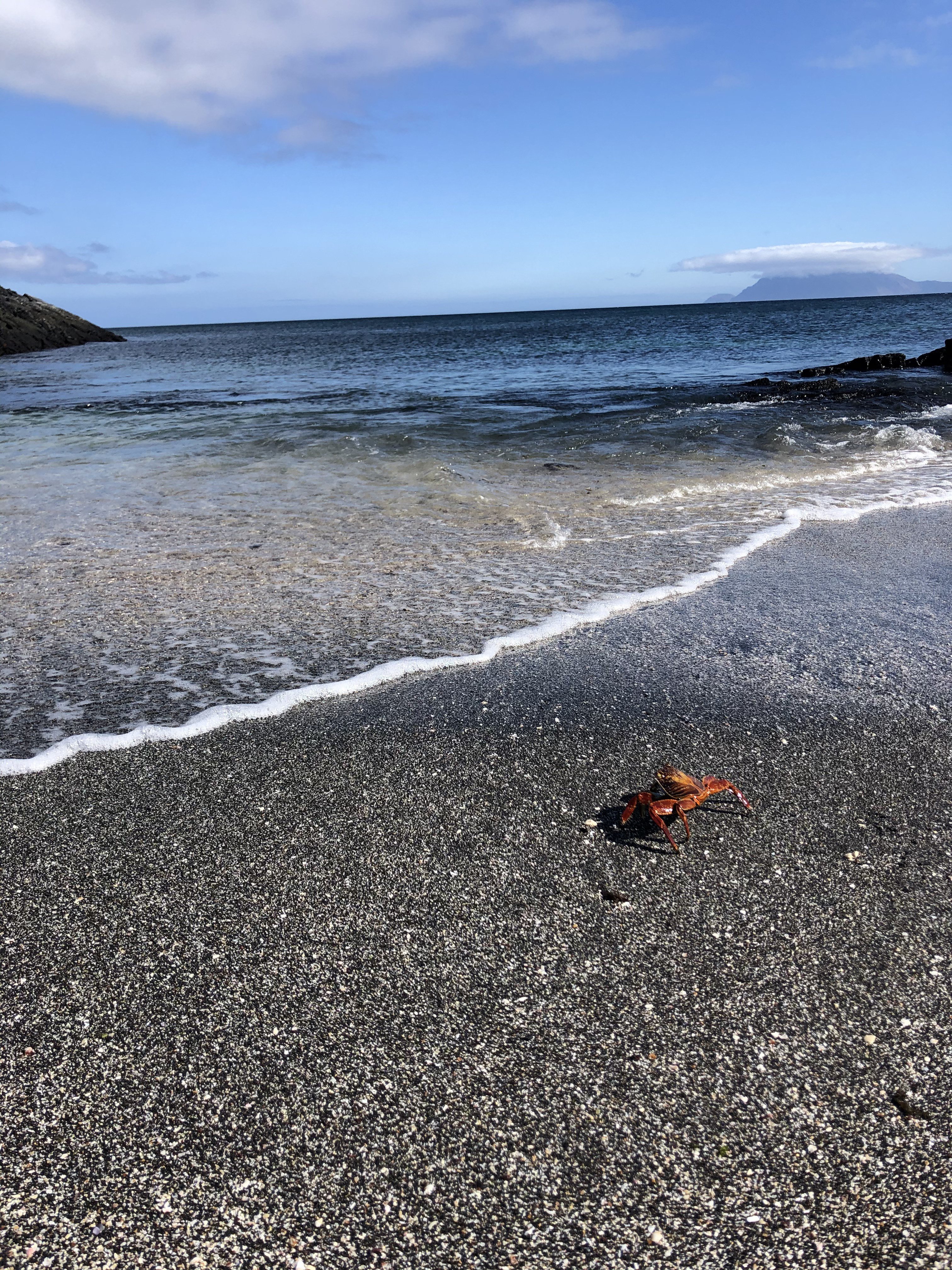 The morning started with sunny skies, perfect weather for exploring Urbina Bay. We made a wet landing on a black sand beach that had sea turtle tracks from the night before. During our walk, we learned about the vegetation endemic to this arid landscape, and came across Galapagos land iguanas and, luckily, a few juvenile giant tortoises. Warm from our walk, we took a dip in the sea before returning to the ship.