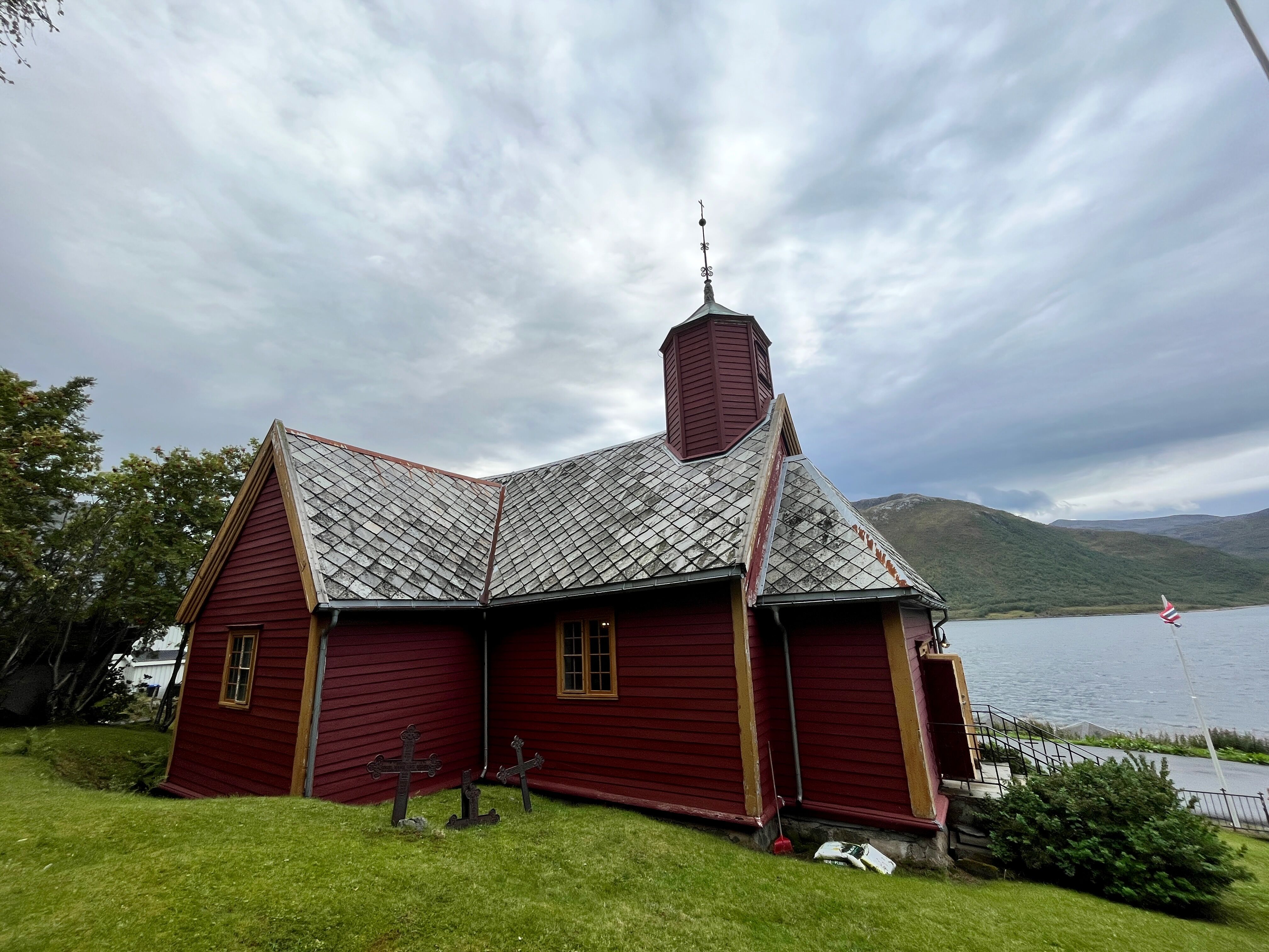 Early, as the day brightened, National Geographic Endurance was found under dark skies and choppy waters. A few juvenile gulls and shags were spotted as the ship made her way into the beautiful Norwegian fjords. By breakfast, we had reached our destination, the charming little village of Torsken. Soon enough, there was an announcement telling us about the outside conditions and sharing orders for disembarkation. As always, excitement for the first activity of the expedition was palpable. After everyone made it ashore, which involved a short ride in the ever trusty Zodiacs, we gathered around our guides for a hike up the valley behind the village or a walk around the village. Before the walk, we were invited to a charming wooden house from the mid 1930s for a sampling of local foods and beer. There was a local waffle with a typical cheese and jam, a piece of flatbread with a delicious spread of salmon, roe, and herbs, and, last of all, a piece of dried cod that paired beautifully with the local beer. Once finished with the sampling, we headed for the charming little church and small gravesite. Inside, we were met by two very helpful people who shared the history of the church. From there, we proceeded to investigate this spot; along the way, we observed the salmon farm. Every day, the farm sends off an amazing one hundred tons of fish to be consumed elsewhere. We saw rowan trees heavy with red berries, roadside plants in flower, and an occasional clump of mushrooms. Lunch was spent on board as the ship changed its location for afternoon adventures. Immediately after our meal, we had the opportunity to meet the field staff and scientists in the Ice Lounge. The afternoon was so different than what we had experienced during the morning. Winds had picked up and blew at 25 knots with gusts considerably over that, which made Zodiac rides to and from the beach landing quite an affair. But, of course, that was no deterrent for us expeditioners. We headed into the elements, spotting some harbor seals and many terns along the way. The flat area around the landing, just beyond a small, sandy beach, was a verdant green with the surrounding mountains rising steeply in the background. The tops of the mountains were covered by dark, swirling gray clouds, giving the whole place a very atmospheric feel. It was stunningly beautiful. The weather led us all to return to the ship a little earlier than scheduled, which allowed us to fit in the first of the recaps, an opportunity to highlight aspects from the day and answer any queries that may have arisen whilst enjoying delicious cocktails prepared by our wonderful bar staff. This day has been most enjoyable, and it was a great introduction to our expedition.
