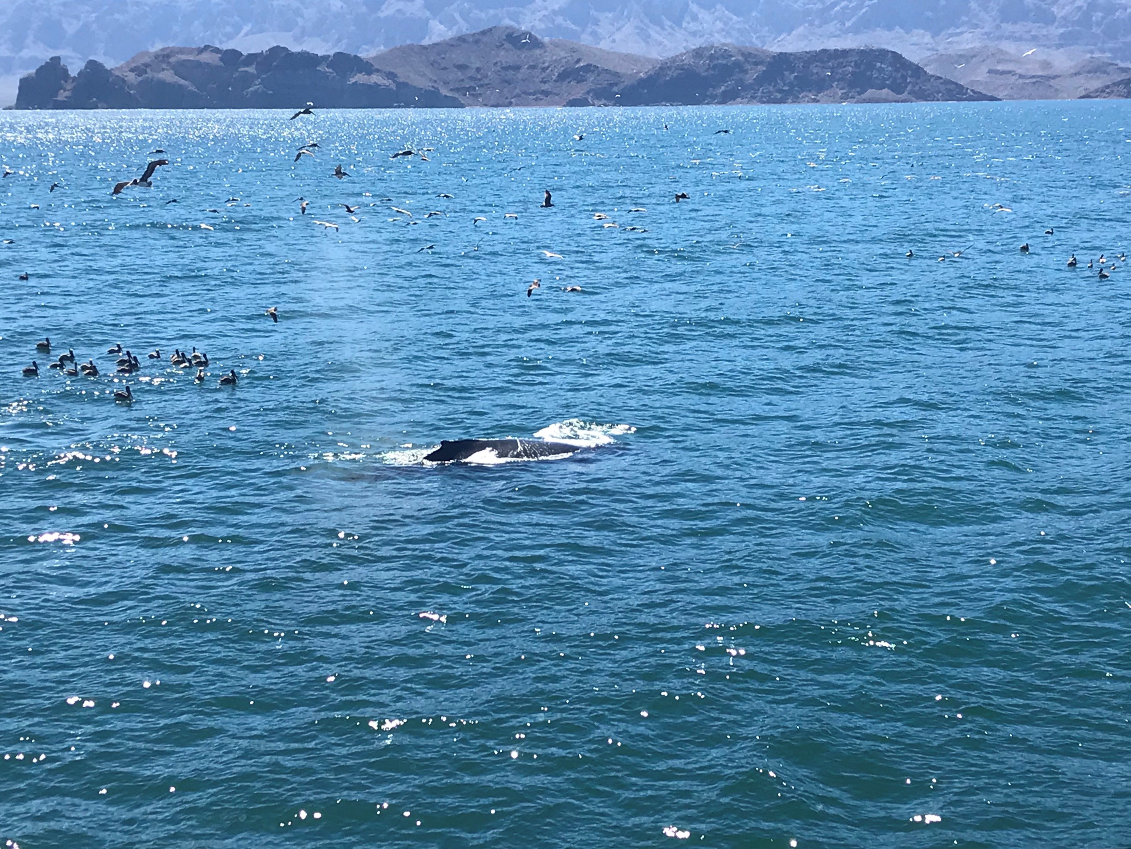Wildlife was plentiful in the spectacular Sea of Cortez today. Beginning before breakfast, a blue whale was spotted off the bow, in addition to bow-riding bottlenose and common dolphins. The dolphins joined us as we made our way to our anchorage, just off the coquina cliffs of Arroyo Blanco on Isla Carmen. This was only the beginning of the show that Baja would put on for us today.