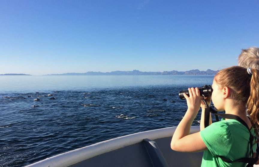 National Geographic Sea Bird left the dock in La Paz last night and sailed north while we slept. We awakened near Isla del Carmen to bright sunshine amidst slightly hazy skies, a light breeze, and 68 degrees Fahrenheit. While some made their way to the bow to see what wildlife might be swimming around, others gathered on the aft bridge deck to greet the day with some qigong. We shook and tapped and grounded our bodies and took in energies of air and sea, sun and earth. At the moment we finished our massage circle, the PA crackled with an announcement of dolphins off the bow. Perfect timing! We made our way forward as the ship arrived upon a scene of a super pod of common dolphins. Wow–amazing to watch these energetic creatures effortlessly moving through the water, some leaping high into the air, some with teeny babies alongside. It’s hard to convey the feeling of being in the midst of this huge pod. We hung out with the dolphins for nearly a half-hour—but then breakfast beckoned us indoors.