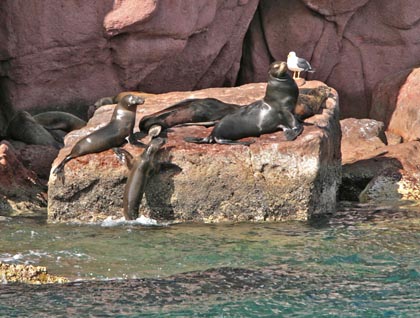 In the afternoon we snorkeled at Los Islotes, small islets a short distance to the north. We dipped into turquoise green water with mask and fins, and had our first looks beneath the waves. Colorful king angelfish, yellowtail surgeonfish, and damselfish swam beneath us. California sea lions slid from their perches on the red rocks and cruised among us; their agile and effortless swimming was a joy to watch. Some of the juvenile sea lions were very curious and playful, and we had some close encounters with a few of them. Many of the sea lions rested and slept in the sun, on rocks near the water. Blue-footed boobies flew overhead, and occasionally we saw their outrageously colored, bright blue feet as they came in to land.