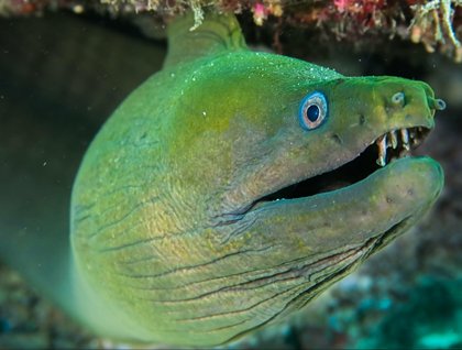 Across a narrow isthmus from the sandy beach in front of which we anchored lay a large rocky stretch perfect for making tide pools at low tide. So in keeping with the example of John Steinbeck and Ed Ricketts, we took advantage of a very low spring tide to explore the creatures trapped within these pools. In these little microcosms naturalists pointed out the stubby-spined pencil urchins, writhing brittle stars, and trapped fish like camouflaged blennies or colorful juvenile damselfish. As the tide returned, guests equipped with snorkels, kayaks, or paddleboards explored the rest of the bay whose rocky reefs teamed with fish life like this panamic moray eel, until a rosy sunset drew the day to a close.