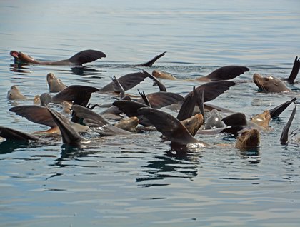After breakfast we prepared for our excursions at the north end of Isla San Marcos. There were choices of hiking up an arroyo, expedition landing craft cruising, kayaking, and snorkeling. There were multihued rocks and flowers along the walk, and the avian highlight was a long-eared owl for the longer walkers! Expedition landing craft cruisers found dolphins, breaching rays, birds, and rafts of sea lions to exclaim about. The rocky coastline was very spectacular. To the south we saw evidence of the gypsum mine, which is still active on the island.