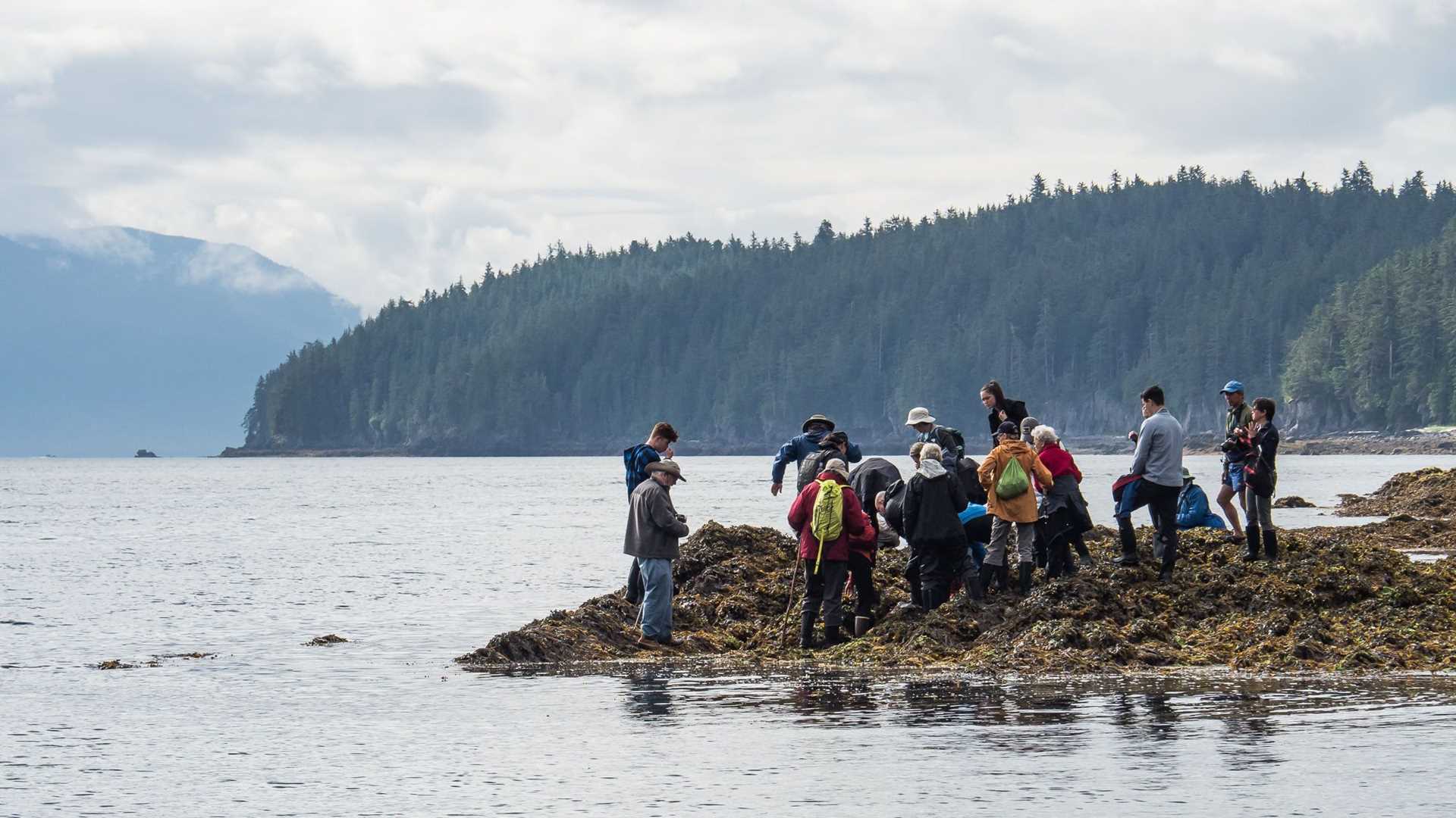 As most were getting out of their bed this morning a lone brown bear wandered the shore of Iyoukeen Inlet before heading back into the long grass and out of view. We were anchored in the sheltered cove that had a promising looking intertidal zone abutting old growth forest—both offering great options for exploration. Many joined our marine ecologists in the intertidal zone, quickly finding a wealth of diversity hidden under the algal blanket. The tide pools offered colorful anemones, sea cucumbers, urchins, sea stars, crabs, and snails. Everyone found their own treasures in amongst the many rock pools. Meanwhile intrepid explorers were meandering into the undergrowth following animal tracks into the depths of the forest while others chose to explore above the water by kayak or paddleboard. While guests returned to the National Geographic Quest for lunch the divers jumped in to take footage from below the intertidal zone. The afternoon was spent wildlife spotting from the bow while making our way south. As if we hadn’t seen enough for one day, our aperitifs were enjoyed in front of Kasnyku Falls and dessert was accompanied by a talk about the local humpback whale populations by Dr. Andy Szabo from the Alaska Whale Foundation.