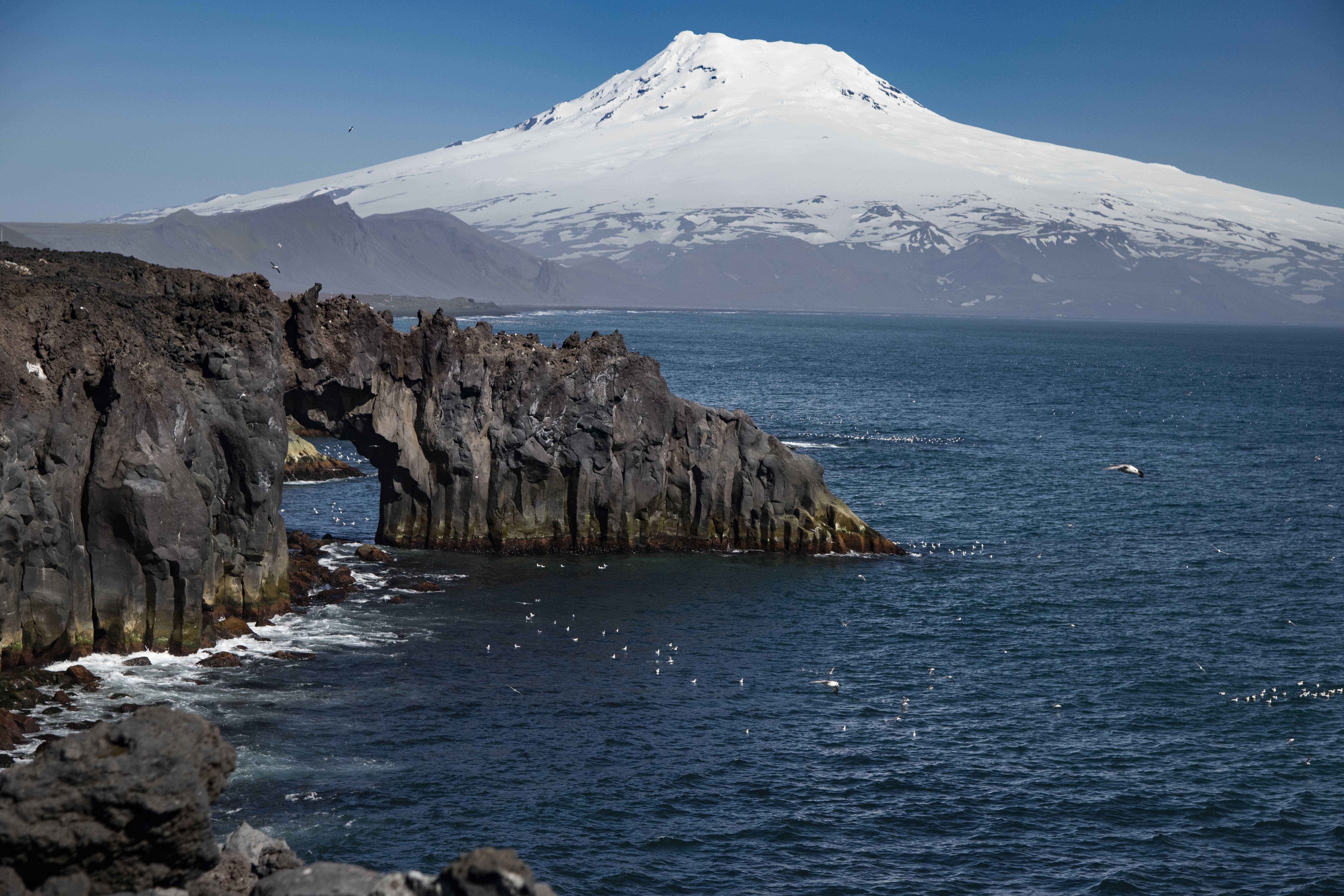 There is something mysterious and mystical about a foggy morning at sea. For a ship full of guests expecting to make land on an isolated island in the High Arctic ─a difficult feat even on clear days ─fog is a bit disheartening. Such was the case as we awoke this morning, sailing towards Jan Mayen, a group of volcanic islands belongs to Norway. You could say that Jan Mayen is the very definition of “out of the way,” or even “in the middle of nowhere.” A weather map of the islands could include the words foggy, misty, chance of rain, and heavy winds, and it would be accurate about 85% of the year. The fog this morning was merely testing our resolve, however. As we approached the islands, the fog lifted, and bright sun and blue sky appeared. As the curtain of mist rose, a wondrous sight met our eyes: beautiful Jan Mayen.
