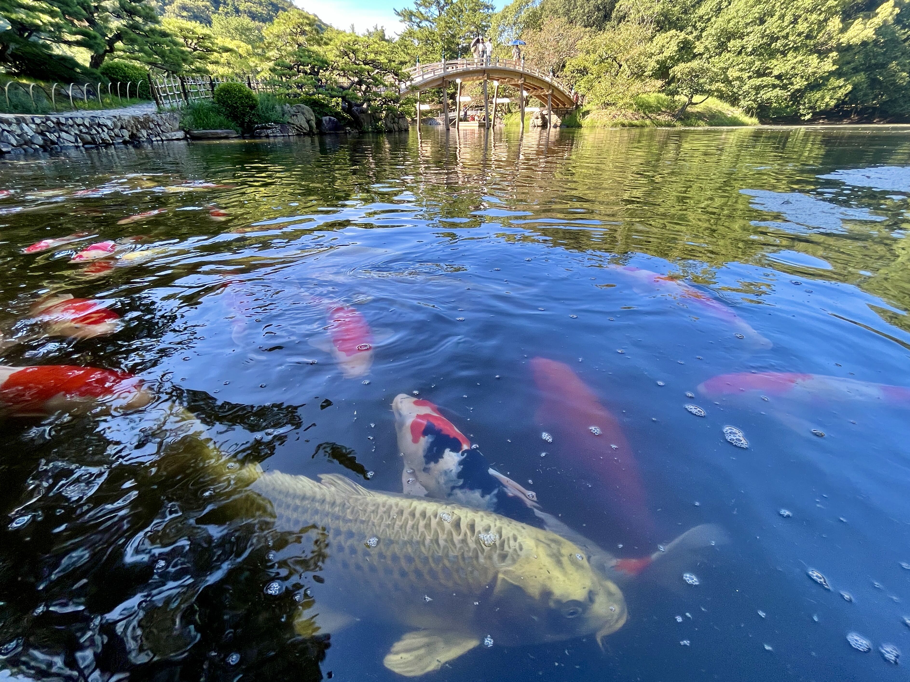 It is hard to explain the calm, peace, and joy experienced when wandering around the fantastic Japanese garden of Ritsurin, one of the most famous Japanese gardens. Walking under the old pines, we admired the wooden bridges and fed the koi. We were transported to the Samurai Period today on yet another gorgeous day in Japan.