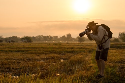 What a terrific day today! As the sun warmed the eastern skies we toasted the day with coffee and croissants. By 6:30 a.m. we were climbing up the Tonle Sap riverbank to a row of oxcarts waiting on a dusty road. Everyone climbed in and we were off, traveling down the rutted road as the sun rose in glorious colors. After ten minutes or so we stopped for a break in a rice field, where our guides talked about rice growing and harvest. We also trekked out to a lotus field where we picked a lotus pod and tasted the seeds (nutty and delicious). On the way back to our carts we found a frog, agamid lizard, and photogenic spiders. Once back onboard our carts we headed into town to visit a small school. A highly motivated young teacher has created an English language program for almost 300 students. We arrived for the flag-raising ceremony and national anthem followed by a visit to the classrooms. Here the kids treated us to English and Khmer songs and everyone practiced their English together. We returned to the ship by motobike-drawn-carts for a well-earned breakfast.