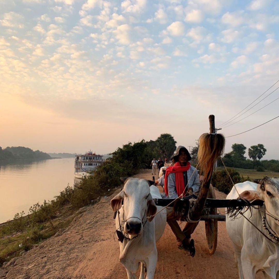 The morning started with an early morning visit to a small village called Kampong Tralach on the riverbanks of the Tonle Sap River. As the sun rose over the Tonle Sap, we loaded into traditional two-wheeled oxcarts organized by local Cambodian farmers. Oxen took us through green rice paddies and lotus ponds seemingly transporting us back in time.