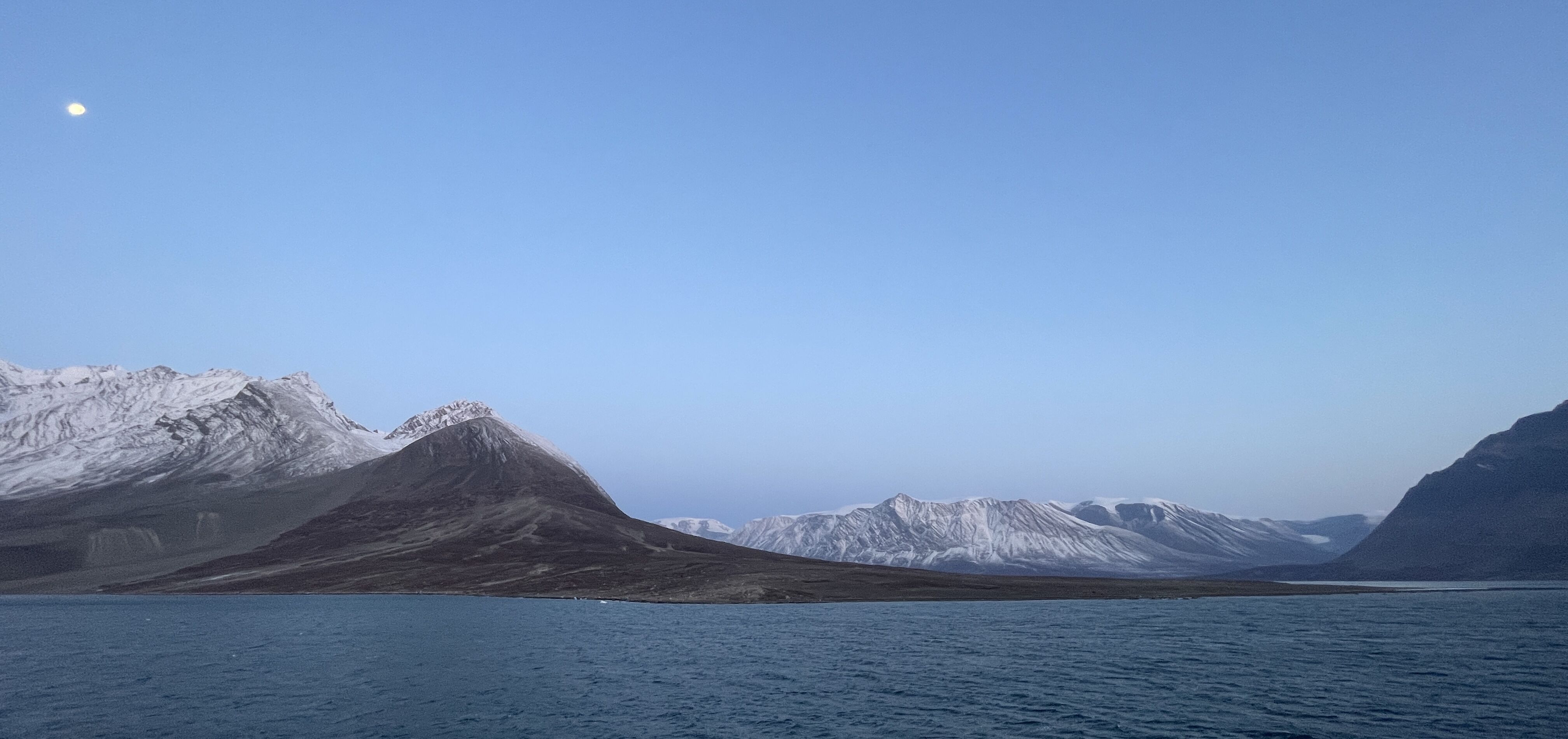 When we woke up, it was still dark outside. As we neared Kap Maechel toward the end of dawn, we could see the shores. We were scanning for muskoxen. And sure enough, there they were…a small herd of four, three adults and a young one, were grazing high up on the hillside.