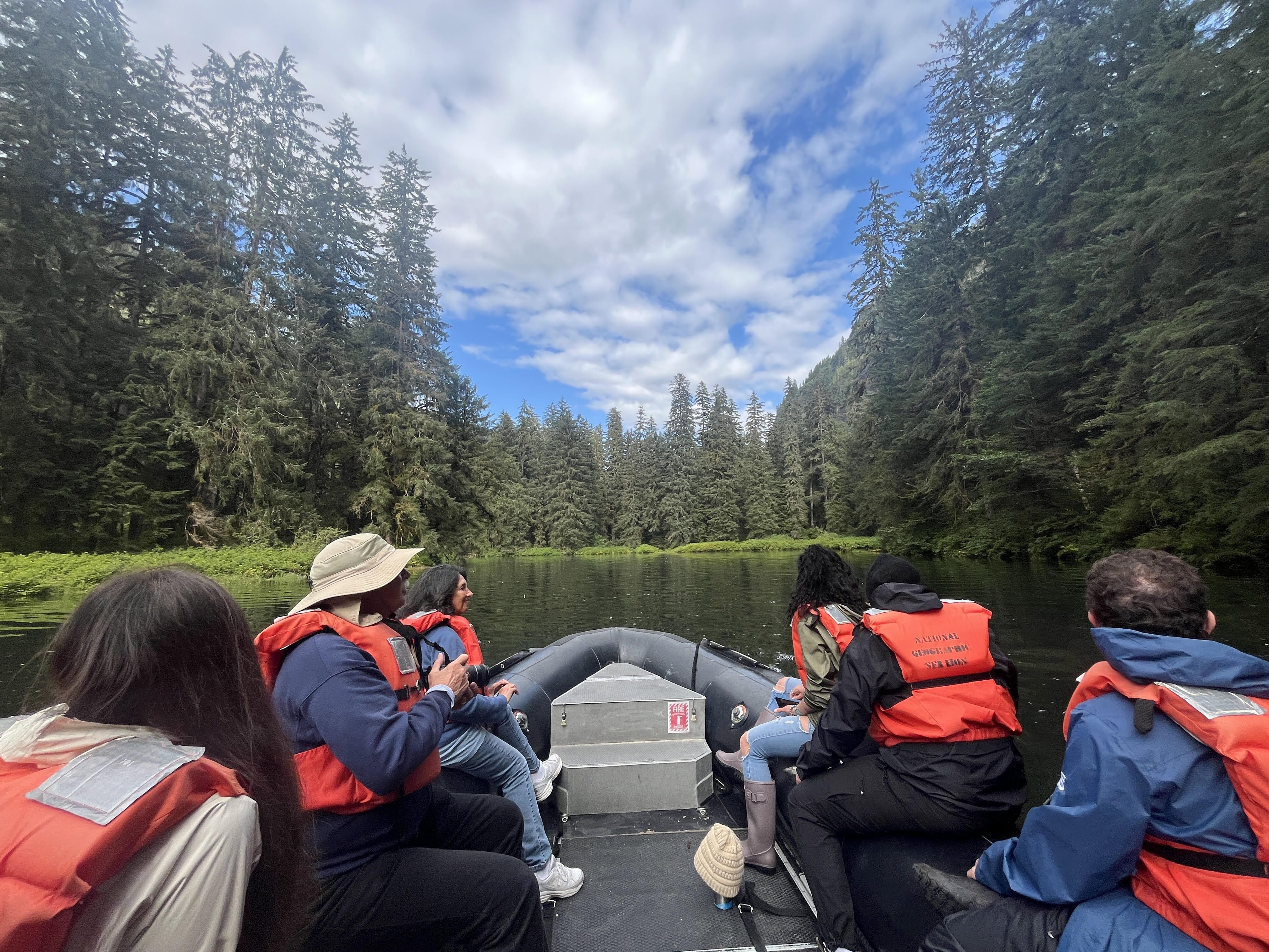 We woke up to a beautiful morning onboard National Geographic Venture, cruising Chatham Strait in route to our morning destination for kayaking and hiking in Kelp Bay. We were greeted by six humpback whales logging and diving at the entrance of the bay. Hikes ashore included bushwhacking through a mossy forest to reach a muskeg and bog lake, where we encountered many woodland creatures, including banana slugs.