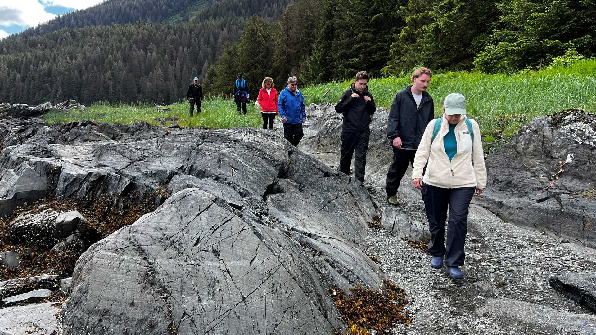 National Geographic Venture sailed south along Chatham Strait on June 14 under partly cloudy skies. The ship entered Kelp Bay on the east side of Baranof Island before breakfast, and guests prepared for a day of adventure in the middle arm of the bay. We split into groups for hikes along the shoreline and Zodiac cruises in the bay. After a spectacular morning with bear, orcas, and deer sightings, we continued south in Chatham Strait to pick up Andy Szabo from the Alaska Whale Foundation. National Geographic Venture continued south along Chatham Strait to enjoy a lecture on humpback whales and a fine dinner with orcas circling the ship.