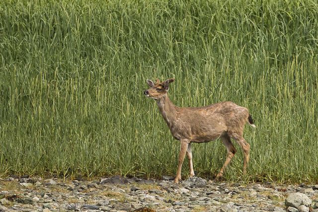 Baranof is one of the three ABC islands of the Alexander Archipelago, famous for their large population of brown bears, and this one looked at us for a long time while we watched him, before heading back into the forest. A short time later, we discovered three Sitka black-tailed deer on the beach; two bucks and one doe of that sub-species of the black-tailed or mule deer, endemic to the Alexander Archipelago. They allowed us to watch them for a long time, something that this shy creature rarely permits.