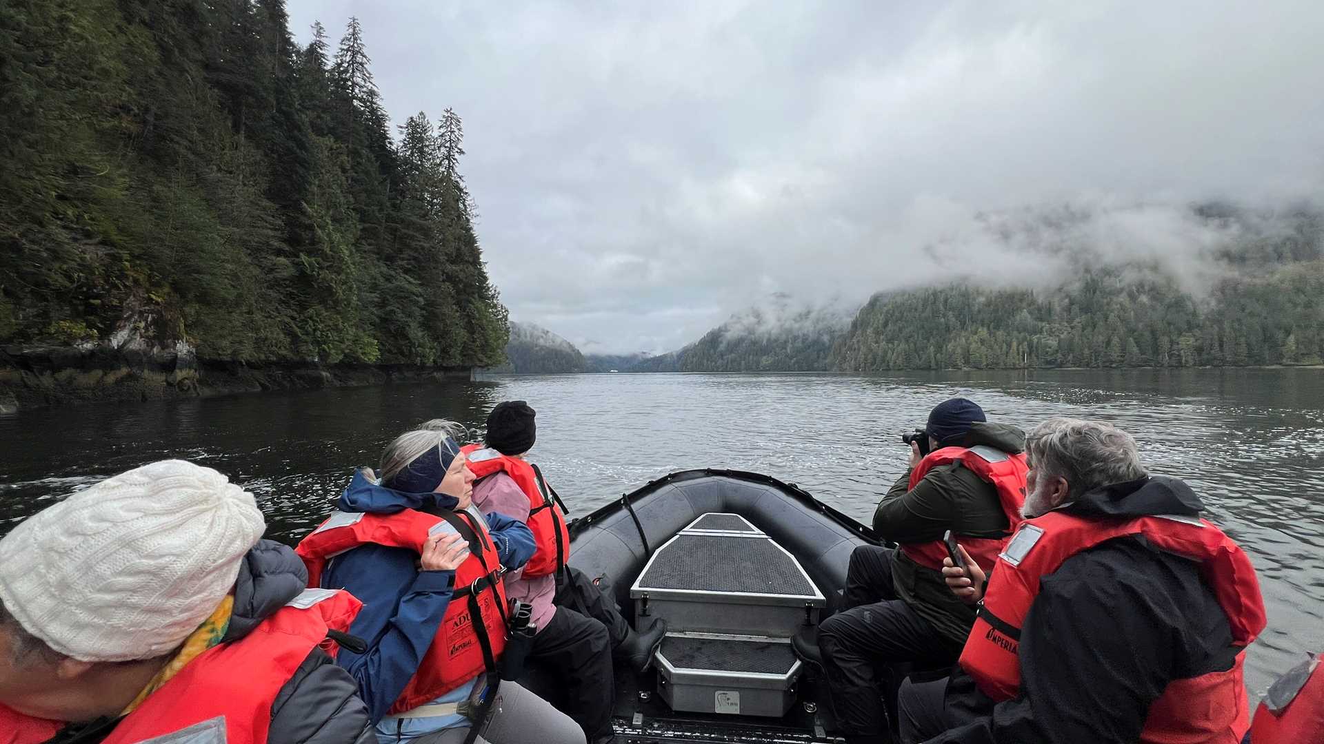 Our day began with a thrilling Zodiac cruise through the serene waters of Kitasoo Xai'Xais Territory, where we marveled at stunning waterfalls cascading into tranquil fjords. The morning's calmness was perfect for kayaking, allowing us to glide through reflective waters and soak in the peaceful beauty of the landscape.