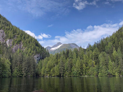 The afternoon was spent exploring Klewnuggit Inlet. Two rounds of activities were given with options for kayak and Zodiac cruises. Harbor seals, seabirds, and a couple of mink sightings made for productive excursions. At the top of the inlet there was a beautiful flowing stream that is sometimes home to salmon. This might explain the schools of a thousand fish or more, swimming around the inlet. With today being a full moon, this allowed for the maximum difference in tidal fluctuation at almost 20 feet!