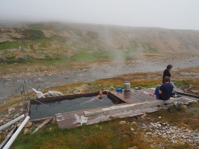 There was no sign for the place, and no trail to get there. There was just hot water pouring out of a hillside just above the river, a sort of a box dug out of the ground next to it with a bit of decking around it, a plank bench supported by two whale vertebrae, and some very shaky stairs down to the river. But the water was deliciously hot in the pool, and bracingly cold in the river, and the whole experience was wildly fun. The steam from the hot tub rose to mingle with the mist above our heads.