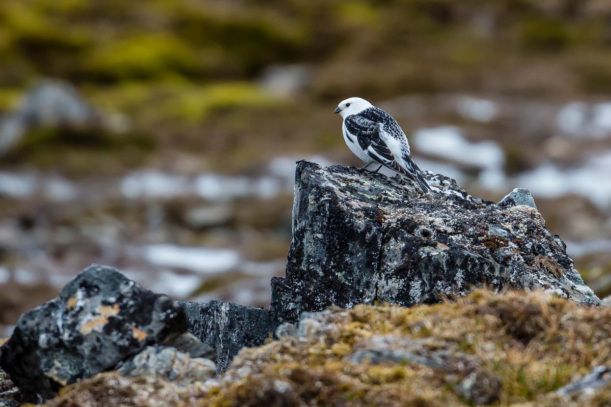 Soon enough we set out. The walks are over abundant vegetation made up of mosses, a wide variety of lichens, and more flowering plants than we have seen before. Many of the flowering plants have not flowered yet. The rocks are jagged and the little protected bay where we land is filled with small pieces of ice, which come from the huge glacier some distance from where the ship is anchored. The steep mountain slopes glow in a rich palette of greens, these give way to almost vertical cliffs that are home to hundreds of nesting birds, mostly guillemots, little auks, kittiwakes, and some puffins. Once ashore we spot some reindeer in the distance as well as a lone and very rotund ringed seal hauled out on a piece of ice. Arctic terns patrol the shore, the occasional pink-footed geese fly overhead, and snow buntings can be heard at regular intervals.