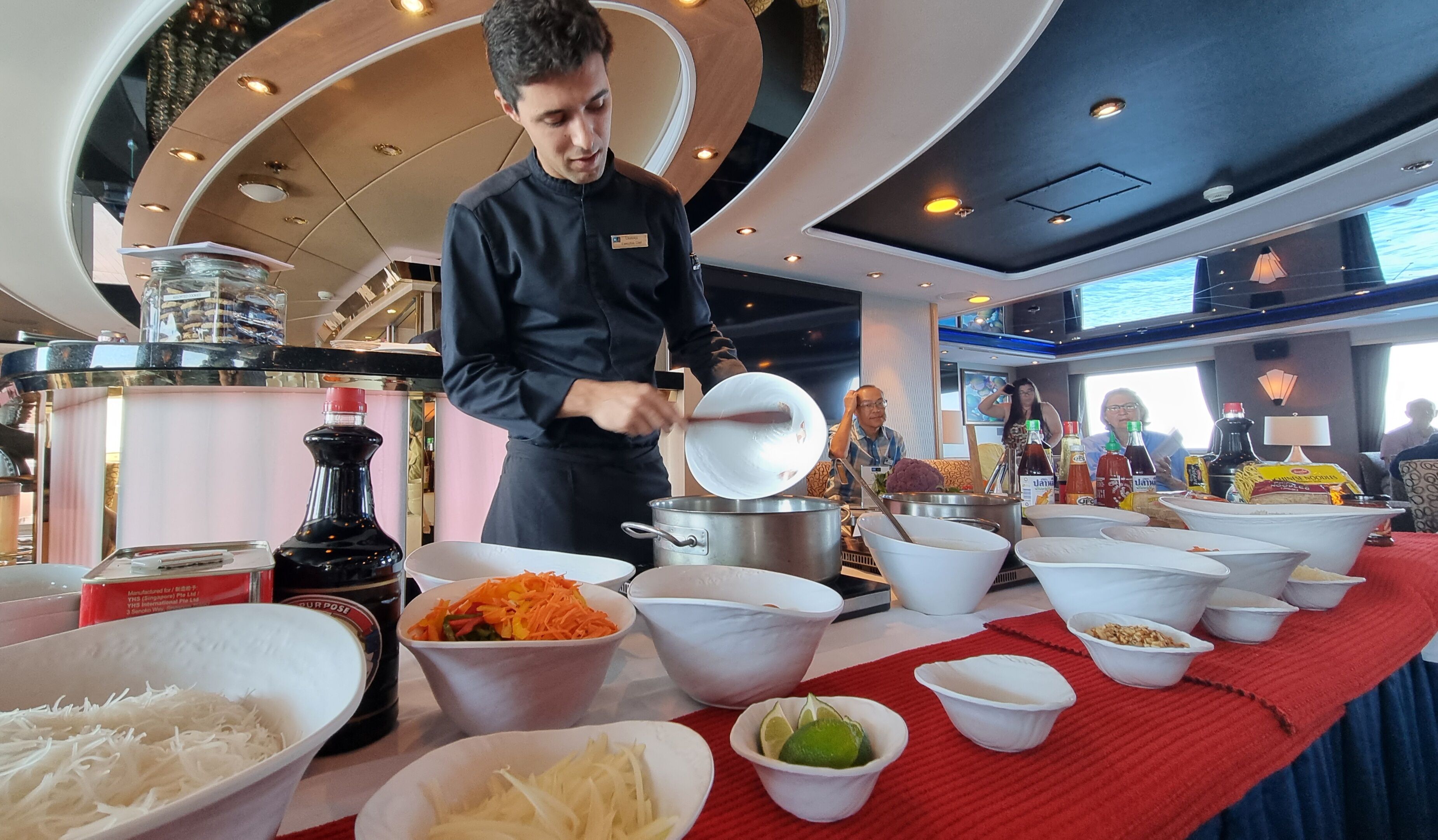 We docked at Kopang in the morning and were greeted warmly by traditional dancers. We all jumped onto local buses for an excursion around town. We stopped at a Christian church and museum, the local market, and finally, a souvenir shop where we observed ladies making traditional cloth.