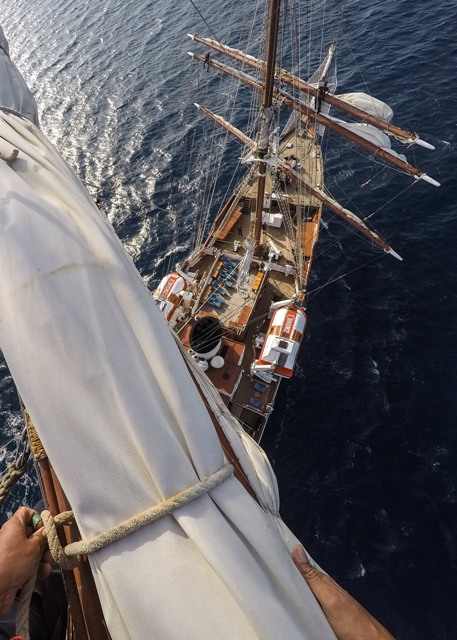 We had calm seas as we sailed at six knots on a starboard tack into the jewel-like harbor of Korcula. The wind was fresh and the sun bright overhead. The sails were up by 9:00 a.m. and we were breezing along at six knots. Imagine the wind alone was moving 2,500 tons of ship through the water at such speed. I sometimes wonder why in this age of ecological concern we do not harness the wind to move freight again across the seas.