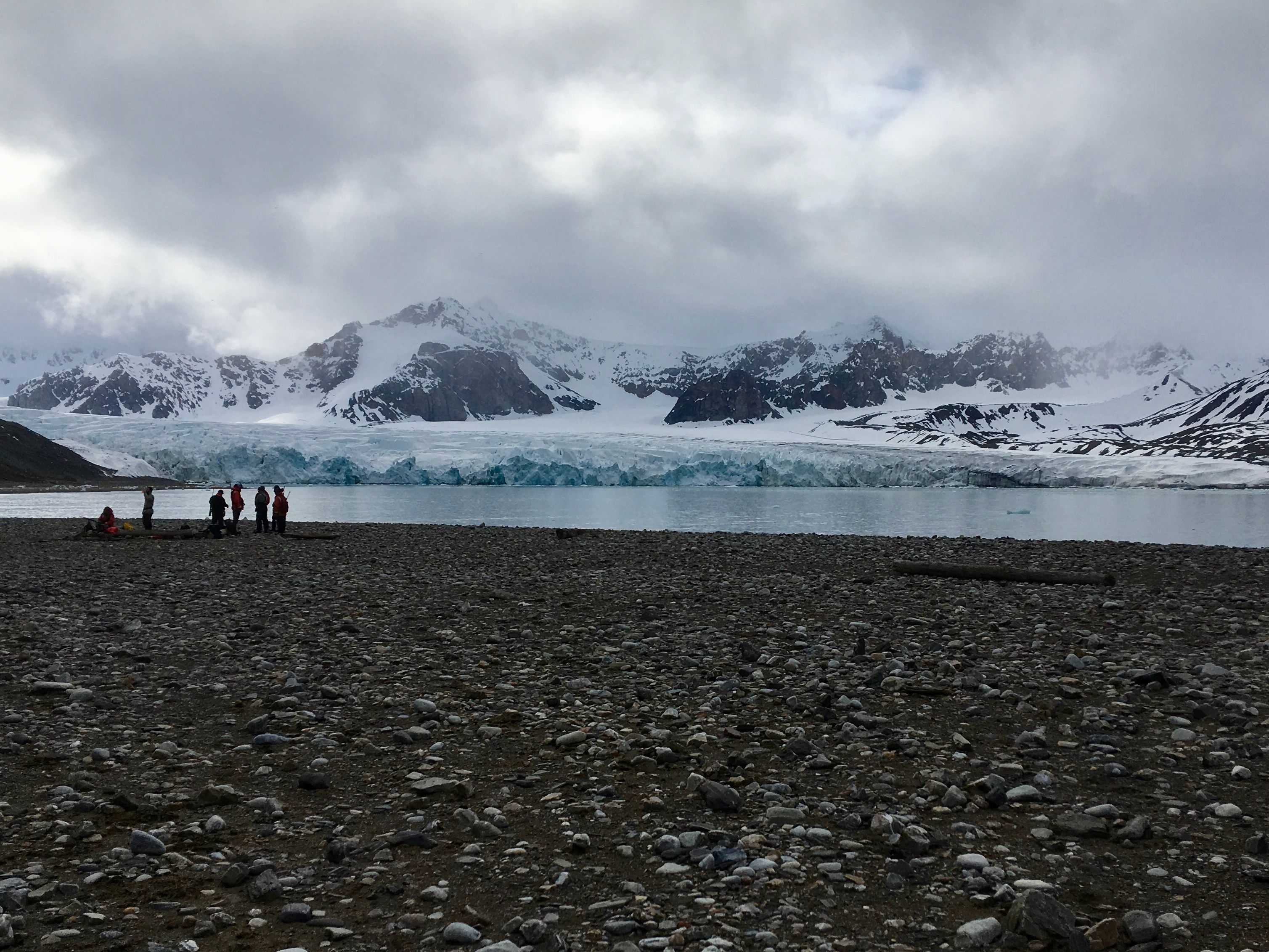 Early this morning we entered Krossfjorden on the northwest side of Spitsbergen Island. The sky was gray, but the scenery was spectacular. The cliffs that surround the fjord had a sprinkling of fresh snow from last night and the air temperature was also relatively mild, an almost balmy 35°F!