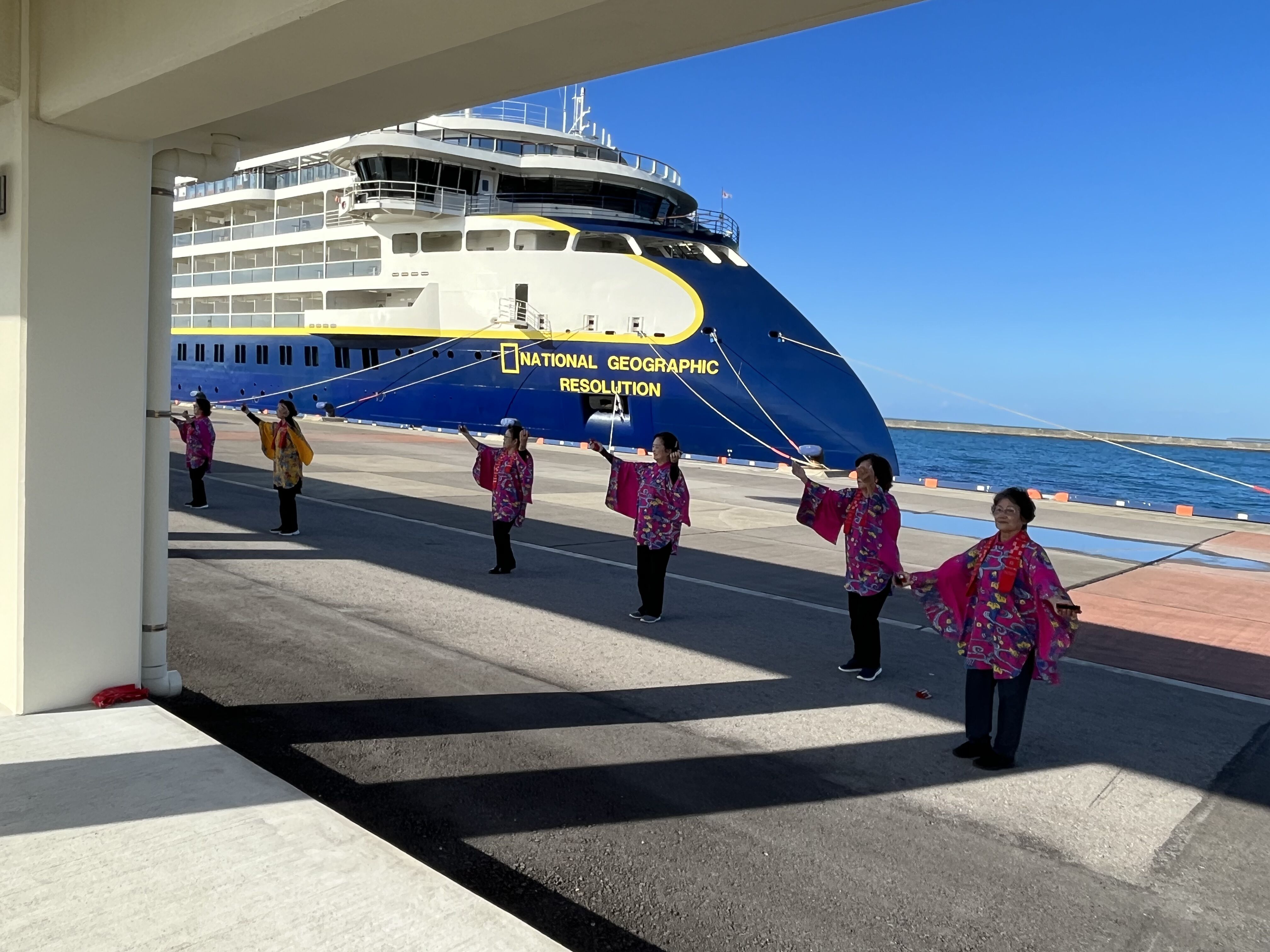 A bright dawn welcomed National Geographic Resolution to Yonaguni Jima, the last Japanese Island we will visit on this trip along the Ryukyu Islands chain. As the sun warmed the sky during breakfast, the sea transformed into a beautiful blue that perfectly matched the colour of the ship’s hull. There are no large ports on the island, so the Zodiacs came out one last time to shuttle guests onto Nama Beach inside the breakwater at the western end of the island. After we transferred onto some of the island's small buses, we set off to explore, visiting the Tindabana cliffs below the huge rock plateau that overlooks the beach and Agarizaki Cape at the eastern end of the island. A stop at Sakimoto Awamori Distillery revealed how the island's famous awamori alcohol is produced. In a performance at the local community centre, we were introduced to local dance and song and enjoyed snacks. After a hearty lunch on board, many ventured back to the beach to enjoy snorkeling over a sheltered coral reef. Fish darted between corals and seabed wrecks from the small port, and a lucky few spotted an octopus as it held court over its watery domain. Back on board, the final reminder that our time in Japan was at an end came with a customs check, and we diligently filled in our arrival cards for our next stop tomorrow: Taiwan.
