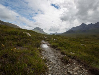 The afternoon offers the opportunity of a leg-stretching hike in the foothills of the Black and Red Cuillins on the Isle of Skye. The Red Cuillins are mostly granite while the Black are comprised of the very rough igneous basalt. Practically devoid of trees this landscape has a desolate beauty to it. Looking upon the glacially carved contours and valleys one gets to see the terrain’s raw form, like muscles under taught skin. There is an almost primal sense of peace that permeates the expanse, instilling a sense of appreciation in the unrefined grace of the mountains. Taking time to sit quietly and absorb the moment, along with a little bit of rain, reflecting upon all we’ve seen, it sinks in that the time to say farewell has come. We have definitely sampled a wide selection of what Scotland has had to offer, savoring every moment, up to and including tonight’s haggis.