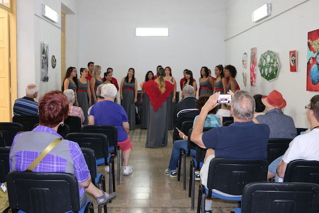 Early in the afternoon we arrived to Cienfuegos, in the Matanzas province. This is a maritime city lying on the shores of a massive bay, founded in 1819 by French settlers. We were welcomed by “Cantadores de Cienfuegos” choir. They sang “a capella” all kinds of music: African, religious, traditional Cuban and from the US. Each song included a briefing on its origin by its seven-year director Honey Moreira. Following the performance, the guests had one-on-one conversations with the performers, about travel opportunities, choir selection processes, training for singers in school. Honey told us that their mission is to keep corale music alive in Cuba, that they find great singers, however it is difficult to find tenors. They practice three hours a day, and they each receive a salary from the government. Some of the singers have been in the group for 30 years, like Alejandro, and a few for a year like Gabriel Santana, who was the main voice in a traditional Cuban song that made us all get up and dance.
