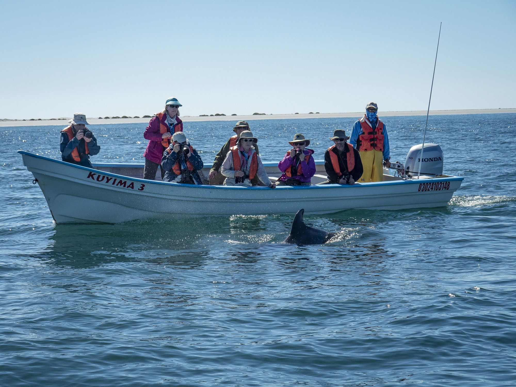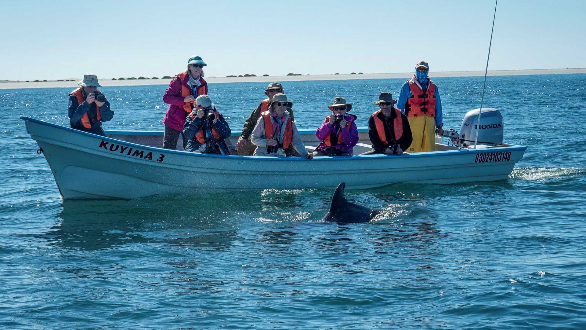Laguna San Ignacio is situated inside a large bight of the west coast of Baja California, about 400 nautical miles south of the US-Mexico border. The temperate, shallow waters of the lagoon attract quite a variety of wildlife. California gray whales arrive near the end of January each year to calve their young. Other migratory wildlife including shorebirds, gulls, dophins, and sea birds all gather here, using the lagoon to stop and rest during migration, or instead spend the winter giving birth to their young. Today, our newest ship National Geographic Venture makes her first ever visit to Laguna San Ignacio while the gray whales are still arriving from their northern feeding grounds. To best view the wildlife up close, we were transported around the lagoon by local guides in traditional “pangas,” the local watercraft of choice. The abundant wildlife of the bay made for a remarkable day of exploration and adventure for our guests.