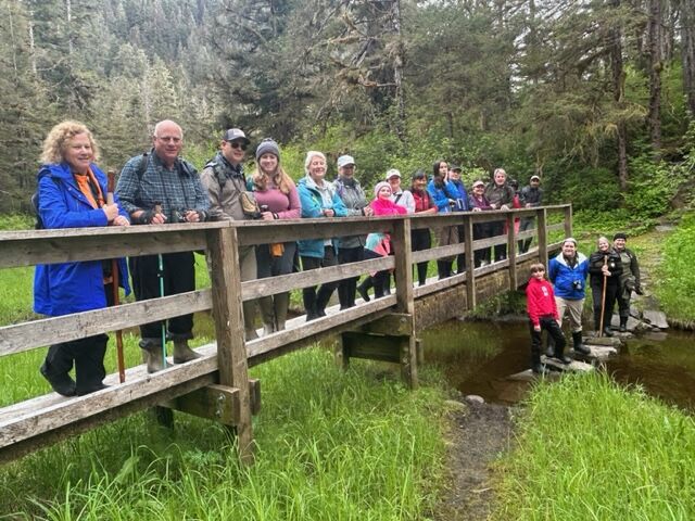 We gained some elevation during our hike to the lake and stopped to drink in the views. It was low tide, so we were able to appreciate how the river meanders. In about another month or so, sockeye salmon will make their way up this waterway for the last time. This area is an important spawning ground for sockeyes. There was once a small fishing village where the Angoon Brown Bear Clan fished, hunted, and gathered food from the temperate rainforest.