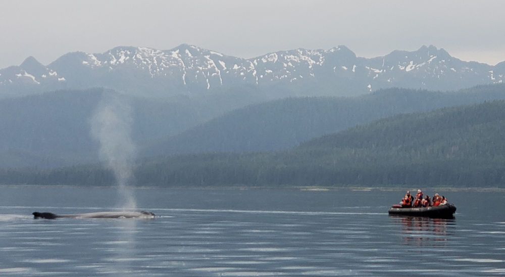 Even before breakfast, whales were spotted in the distance. Although we were already at anchor in Hanus Bay, we quickly ate some coffee, eggs, and oatmeal to start our day. Shortly after, we took to the shore for hikes and to Peril Strait for small boat cruises. The hikers wound up the wooded path and along the shore of a salmon stream to end at Lake Eva, a beautiful small lake that feeds the nearby stream. The boaters headed east up the strait to search for the whales seen earlier – and they were found, feeding lazily, in the silky calm water. Several surprisingly close appearances made our day, even before lunch.