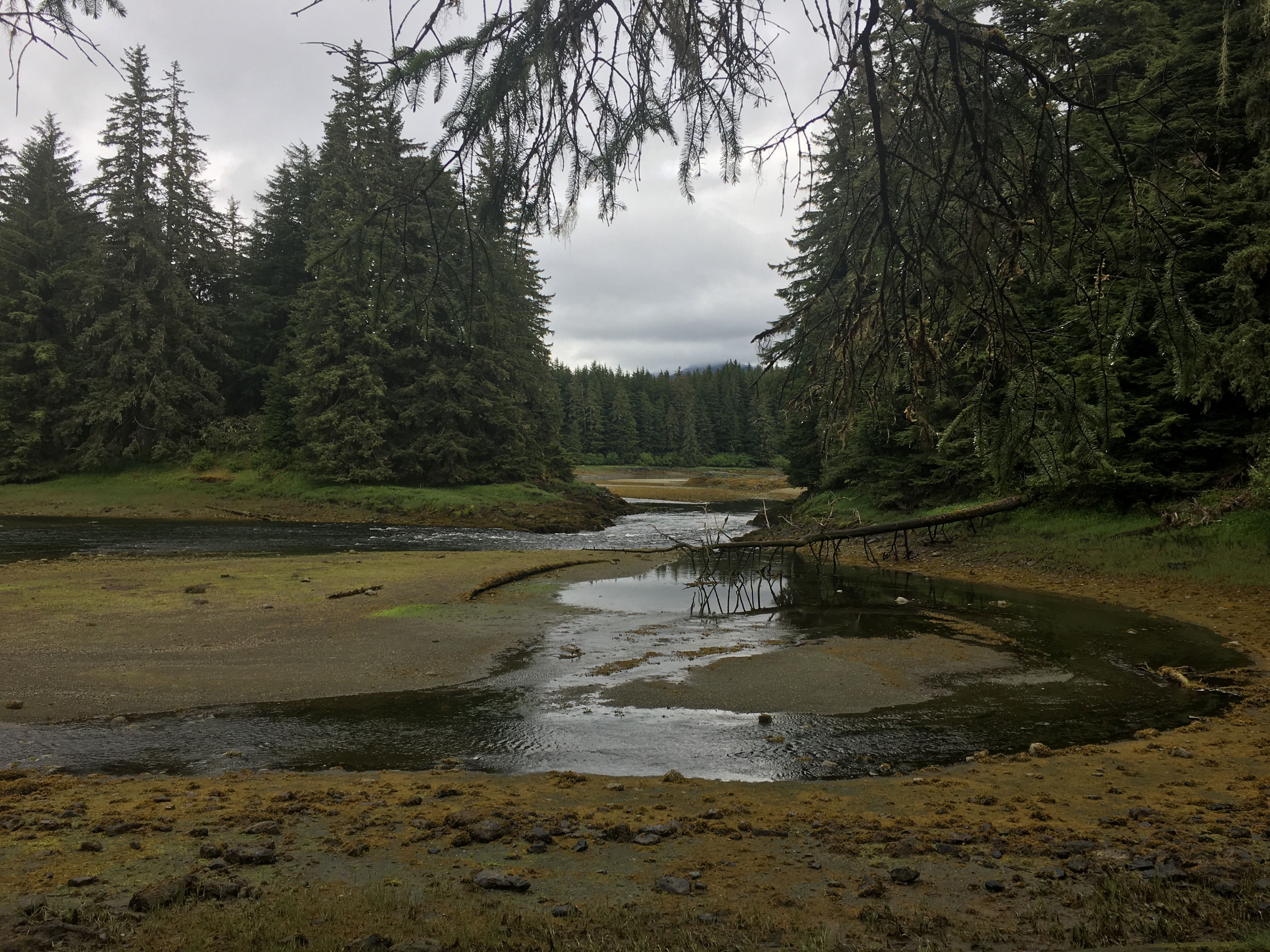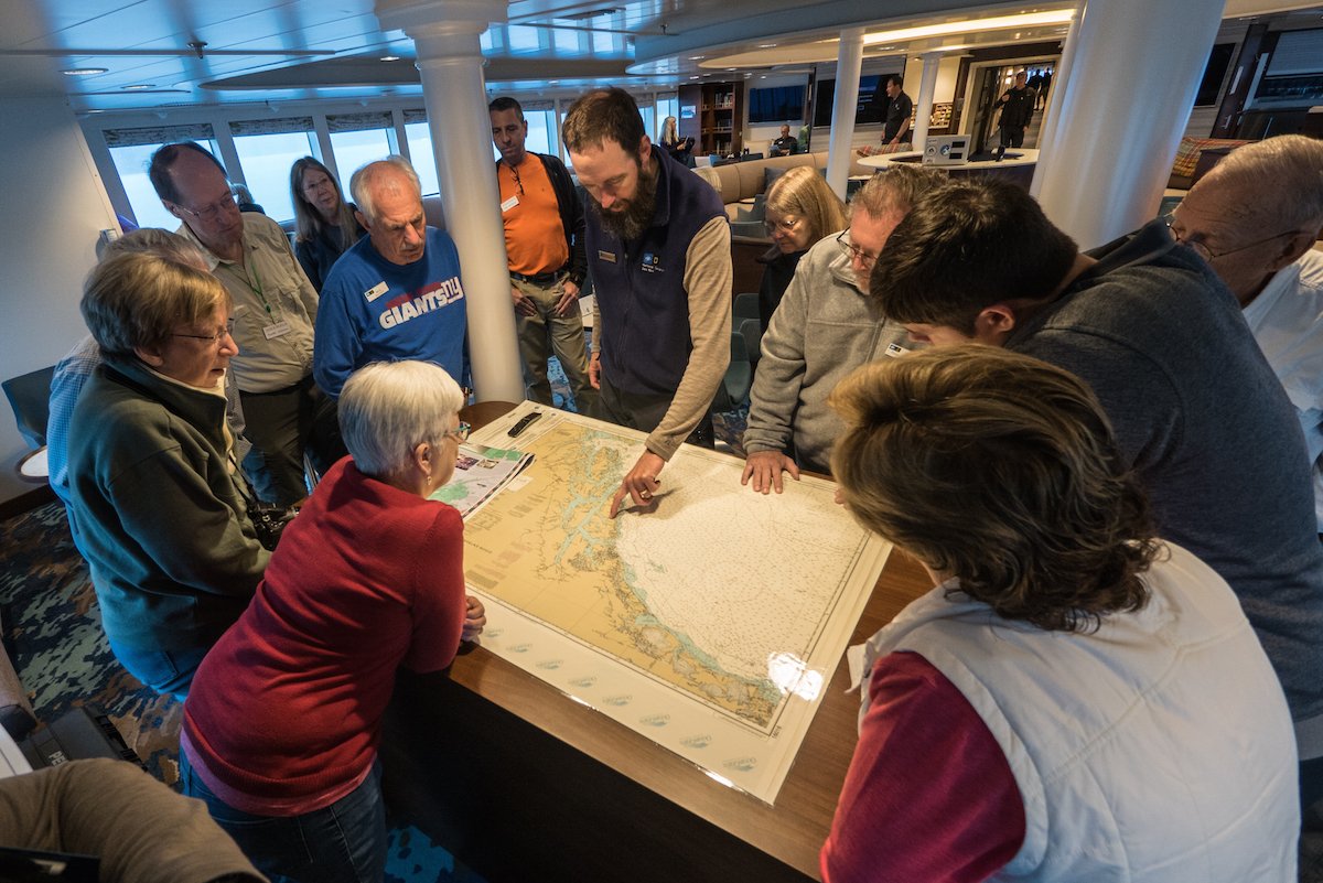 Our morning started before breakfast as we peacefully listened to and watched a humpback whale surface, take a breath, and dive deep again for its own breakfast. After that serene early morning tonic, and with only a little bit of rain, we hiked deep into the coastal temperate rainforest towards Lake Eva, ever watchful for bears, river otters, and other critters of the woods. We marveled at the massive Sitka spruce and western hemlock trees towering above us, like pillars in a cathedral, a temple of wilderness in a unique part of the world. We had not had enough of this inspiring cold-weather jungle, and so in the afternoon we explored the edge of the forest in Sitkoh Bay and learned about the power of the forest to regenerate and all the links between land and ocean. The highlight was the brown bear that blocked our path back to our boat-landing. While we waited to be picked up in a different area—a safe distance from the brown bear—we had a marvelous time watching the bear stroll the beach and eat its dinner of coastal sedges. Tomorrow, we will explore the historical town of Sitka before the end of our journey.