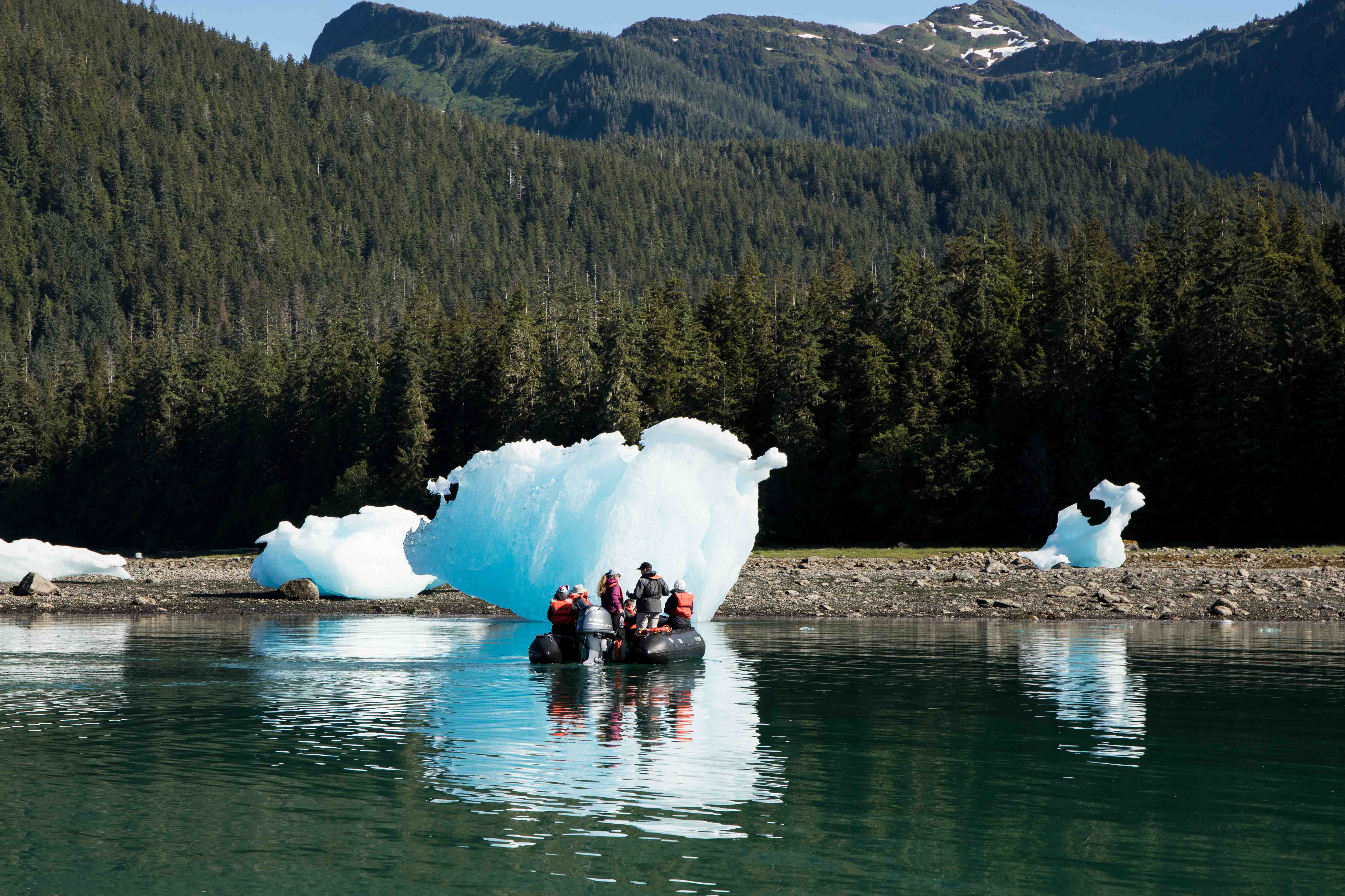 After cruising all night, the National Geographic Sea Bird woke to sunshine this morning. We were surrounded by the ice bergs of LeConte Glacier. The new moon meant the tide was extremely low and we had the privilege of observing hundreds of abstract blue ice sculptures stranded on the shore. After two spectacular rounds of Zodiac cruises, we headed to the fishing town of Petersburg for an afternoon that was packed with activities including hikes, photo walks and even flight seeing.
