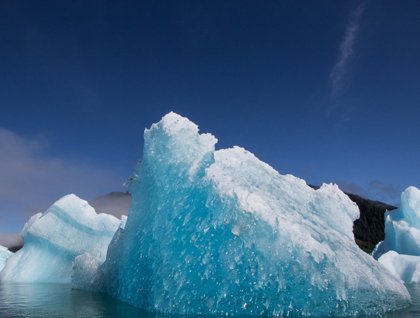 An expedition landing craft cruise among blue icebergs is like floating through a jewelry store for planets. Bracelets of brash ice are strung together like pearls across the arm of the bay, while icebergs stand like cathedrals of crystal, lit from the inside by some deity of light. The color blue captivates your sight, daring you to look at the lowly earth tones of trees, rocks, and muddy water, now reduced to simply provide a background to a celebration of blues.
